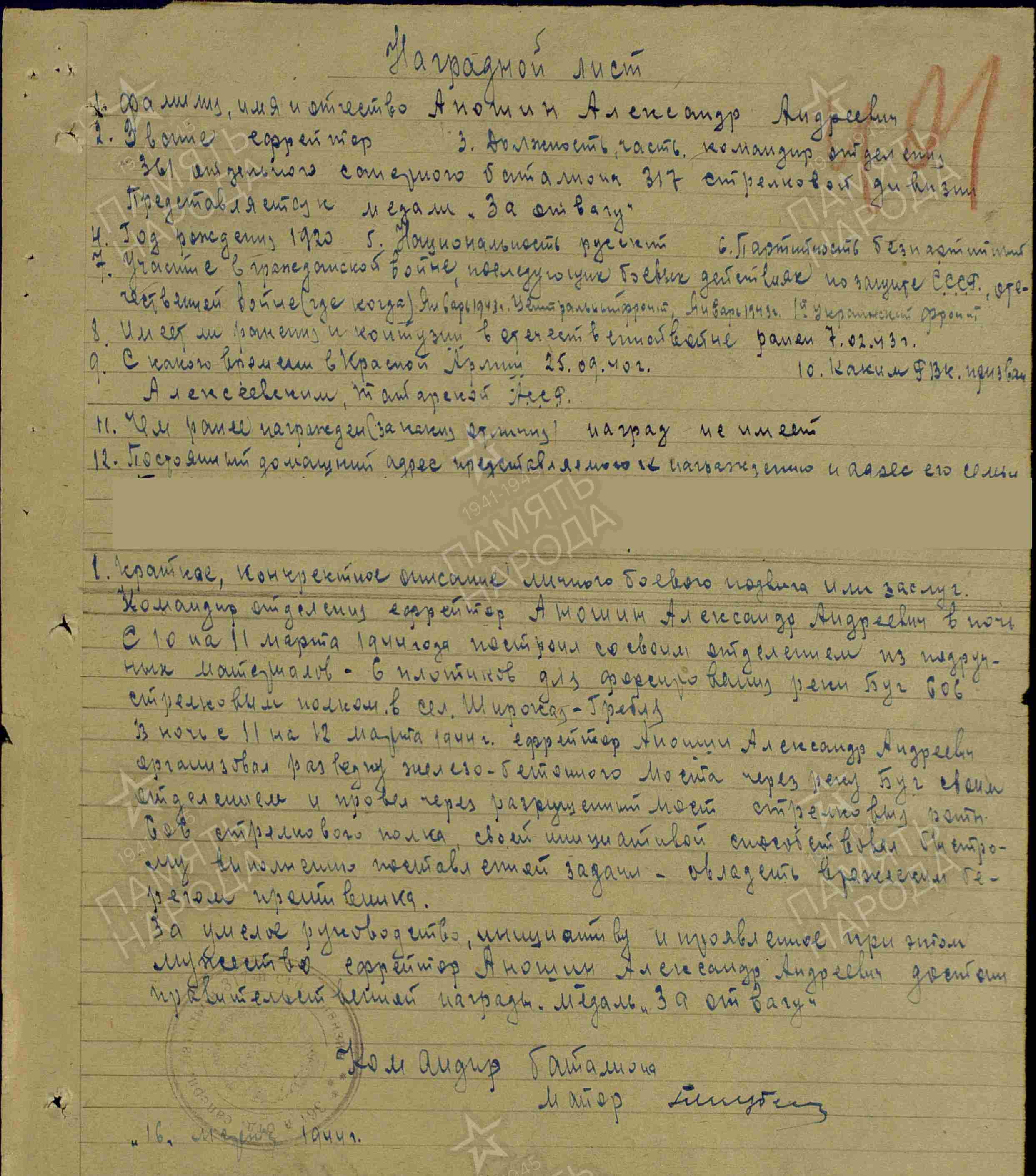 АНОШИН Александр Андреевич, 1920, с. Балахчино. Мобилизован Алексеевским РВК 25 сент. 1940. Ефрейтор, ком. отделения 361 отд. сапёрного батальона 317 СД 18 А. Воевал с янв. 1943 на Центральном, 1 и 2 Укр. Фронтах. Ранен 7 фев. 1943. Отличился при форсировании р. Буг. Награждён медалью «За отвагу», орденом Отечественной войны 2 ст. (1985).