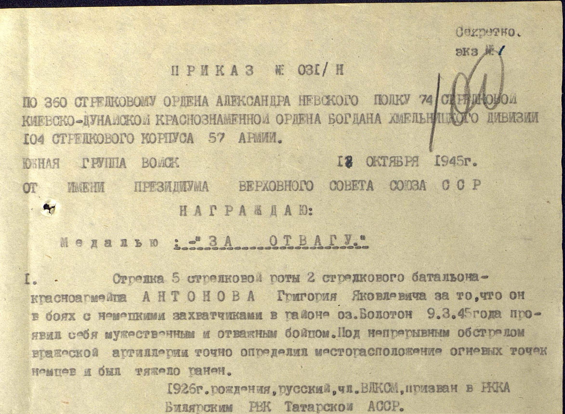 АНТОНОВ Григорий Яковлевич, 1926, д. Красный Баран. До призыва в армию работал в к-зе Им. Сталина, с. Кульбаево Мараса. Мобилизован Билярский РВК в нояб. 1943. Красноармеец, стрелок 360 СП 74 СД 104 СК 57 А 3 Украинского фронта. Член ВЛКСМ. Отличился в боях у оз. Балатон, Венгрия. Ранен 9 марта 1945. Награждён медалями «За отвагу», орденом Отечественной войны 2 ст. (1985).