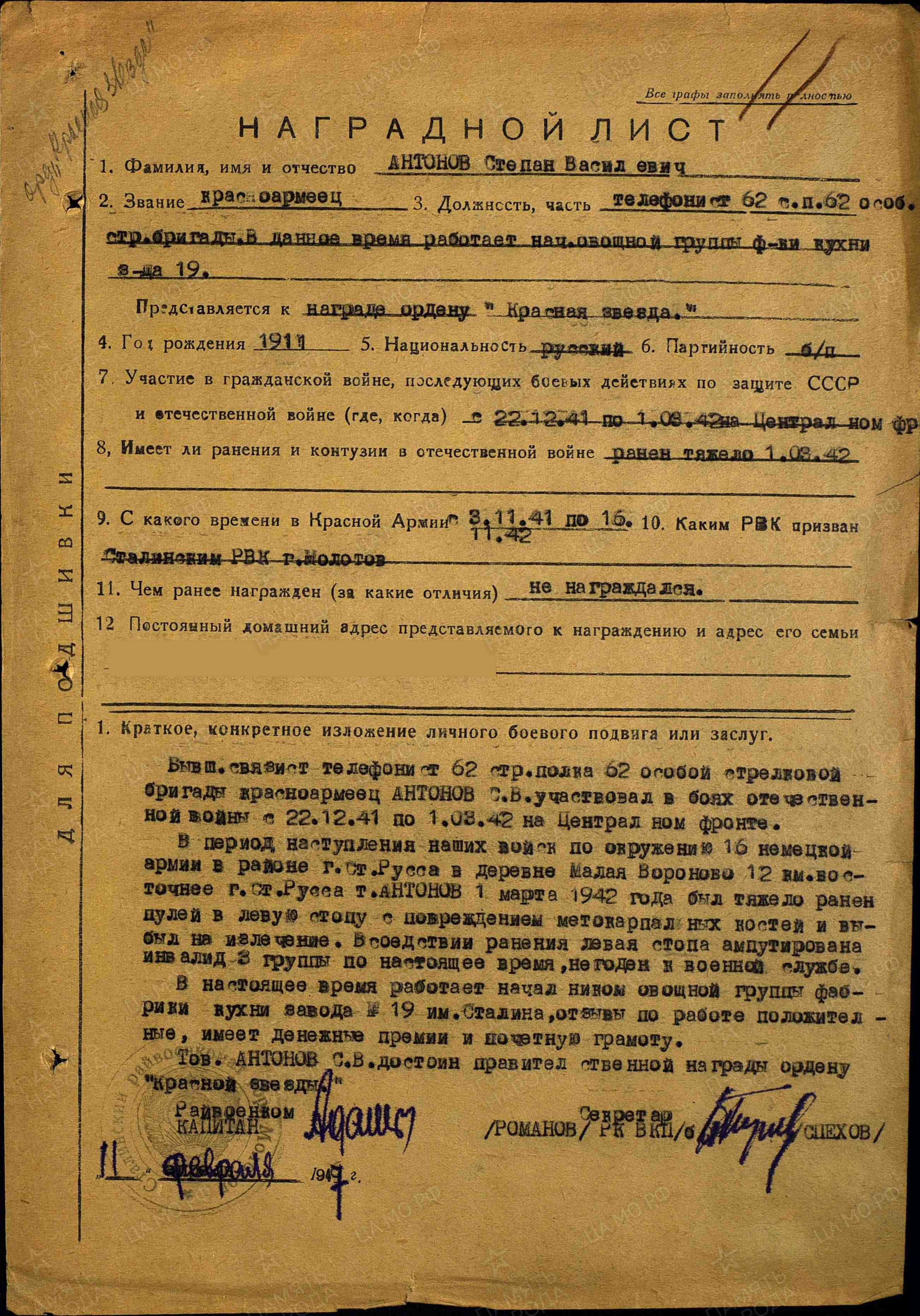 АНТОНОВ Степан Васильевич, 1911, д. Ерыкла. Мобилизован 3 нояб. 1941 Сталинским РВК г. Молотов (Пермь). Красноармеец, телефонист 62 отд. морской СБр 1 УдА Западного/ Северо-Западного фронта. 1 марта 1942, в бою за д. Малое Вороново, Старорусский р-н, Новгородская обл., тяжело ранен в левую стопу с дальнейшей ампутацией. Проходил лечение в ЭГ 1140, г. Кировград, Свердловская обл. Демобилизован по инвалидности 3 гр. 14 нояб. 1942. Работал нач. овощной группы фабрики-кухни з-да № 19 им. Сталина. В 1947, по ходатайству райвоенкомата, награждён орденом Красной Звезды.