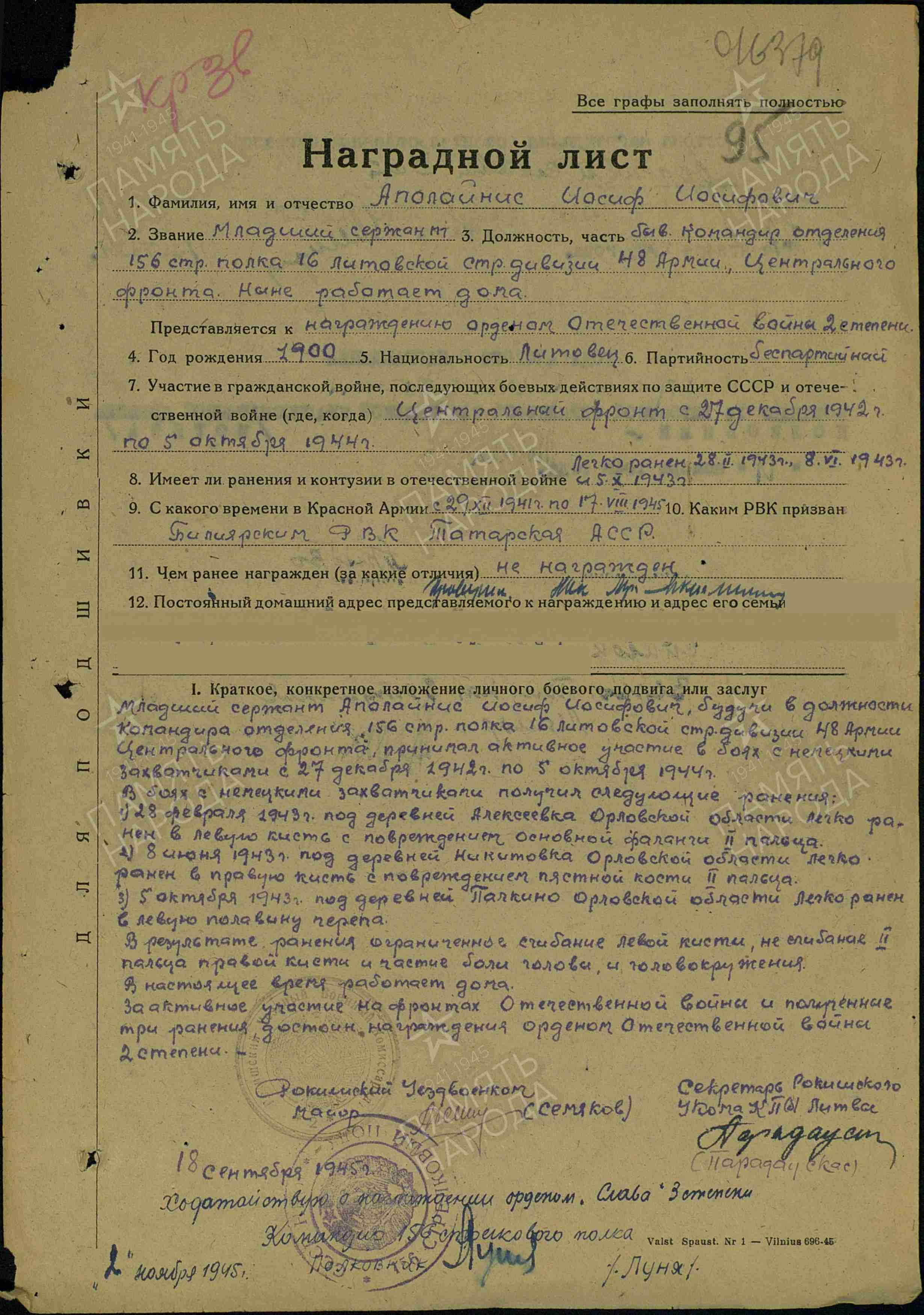 АПОЛАЙНИС Иосиф Иосифович, 1900, г. Рокишкис, Литва. С 1941 – в эвакуации. Мобилизован Билярским РВК 29 дек 1941. Воевал на Центральном и 2 Прибалт. Фронте с 27 дек. 1942. Мл. сержант, ком. отделения 156 СП 16 СД 48 А и 2 Гв. А. В боях получил три лёгких ранения в кисти обеих рук и голову. В 1945 представлен к ордену Славы 3 ст. Награждён орденом Красной Звезды.