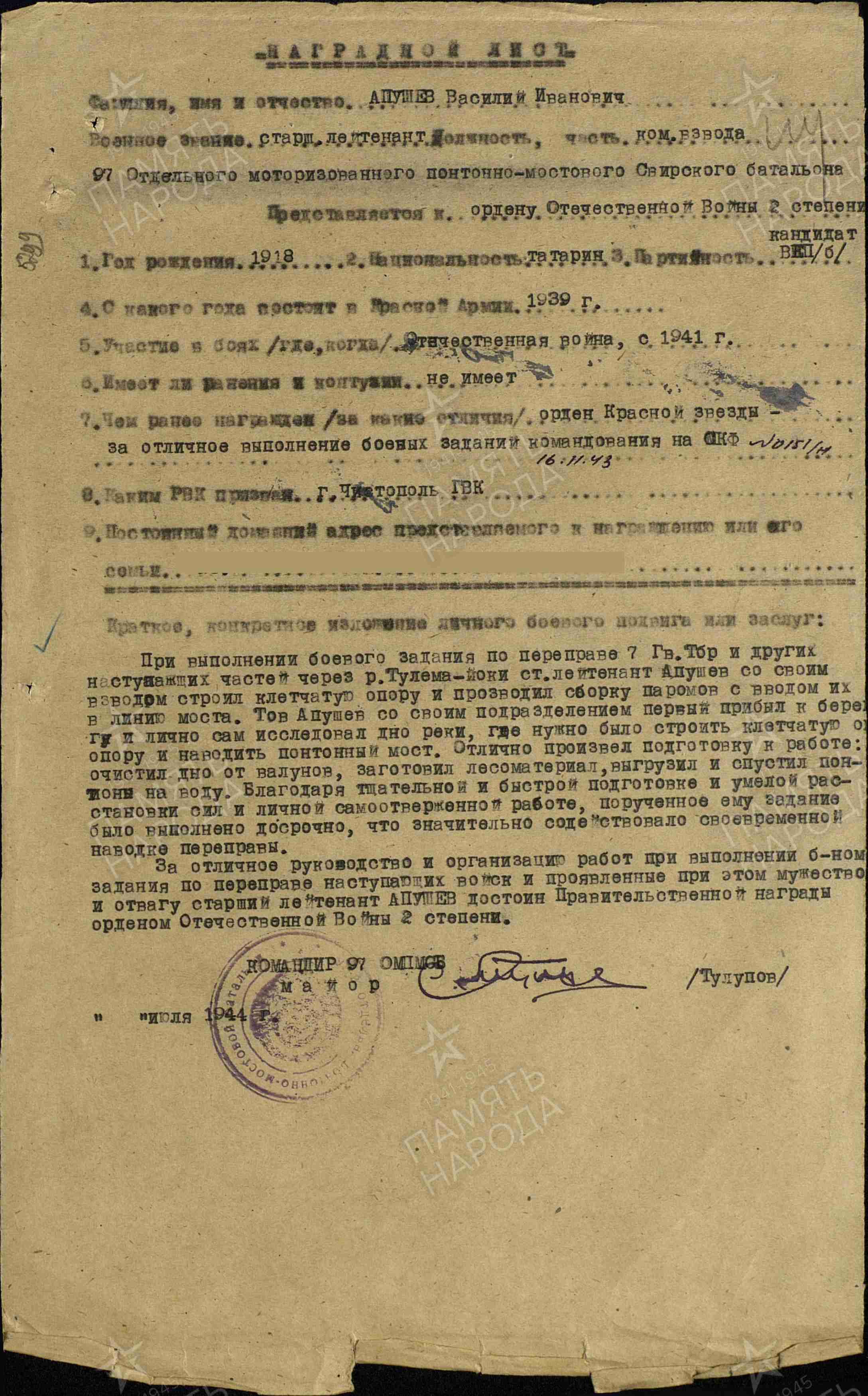 Василий Иванович Апушев родился в 1918 г. в с.Кулущи, Кзыл-Юлдузского района, Татарской АССР. 24 октября 1939 года был призван в ряды Красной Армии ГВК Татарской АССР, с 1941 года участник Великой Отечественной войны. Служил в звании лейтенанта, затем старшего лейтенанта и майона в должности командира взвода 97 Отдельного моторизованного понтонно-мостового Свирского батальона.