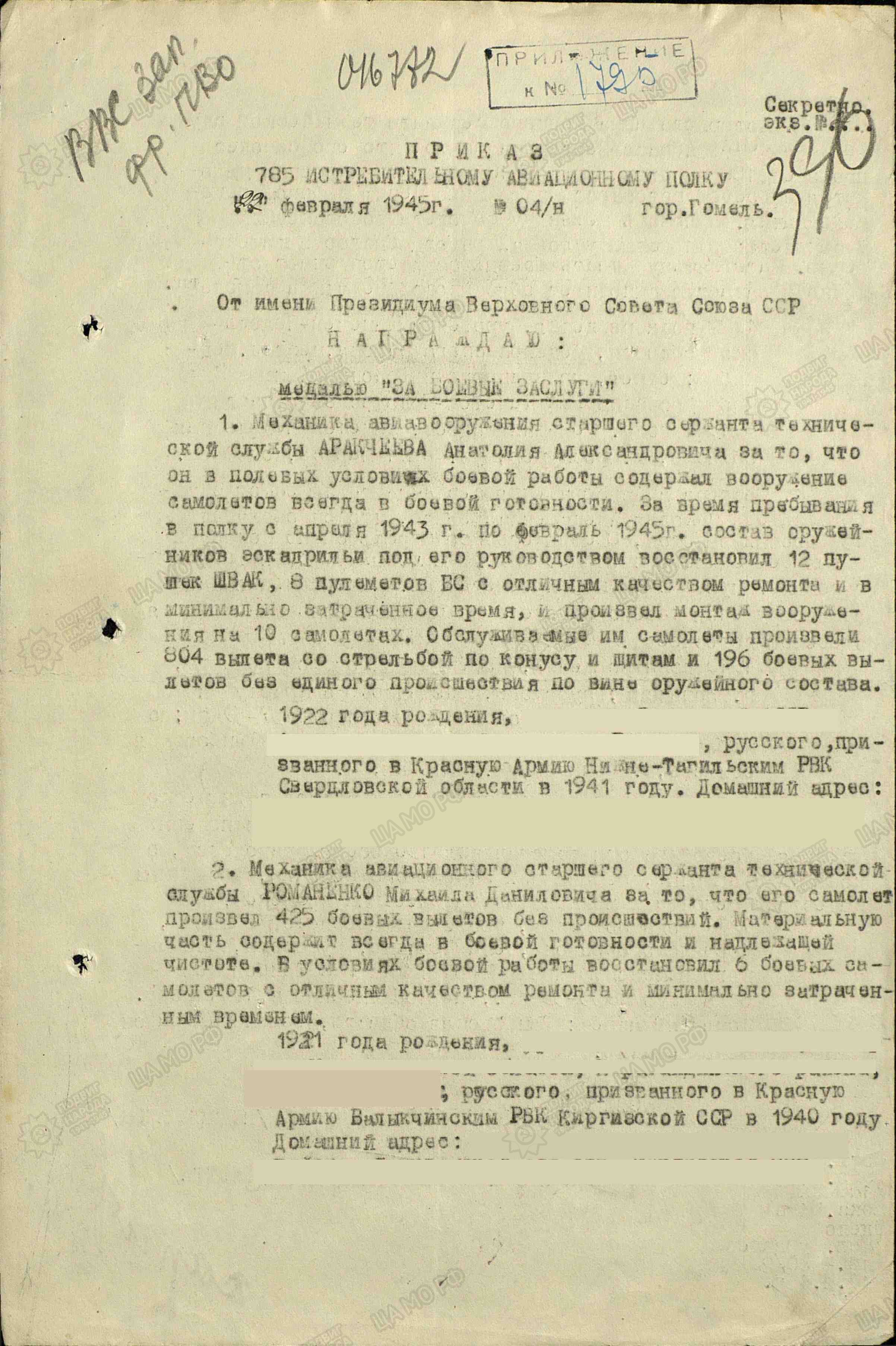 АРАКЧЕЕВ Анатолий Александрович, 1922, с. Ромодан. Мобилизован Нижнетагильским РВК Свердловской обл. в 1941 г. Старш. сержант технической службы, механик авиавооружения 785 истребительного авиаполка. Награждён медалью "За боевые заслуги" (1945), орденом Отечественной войны 2 ст. (1985).