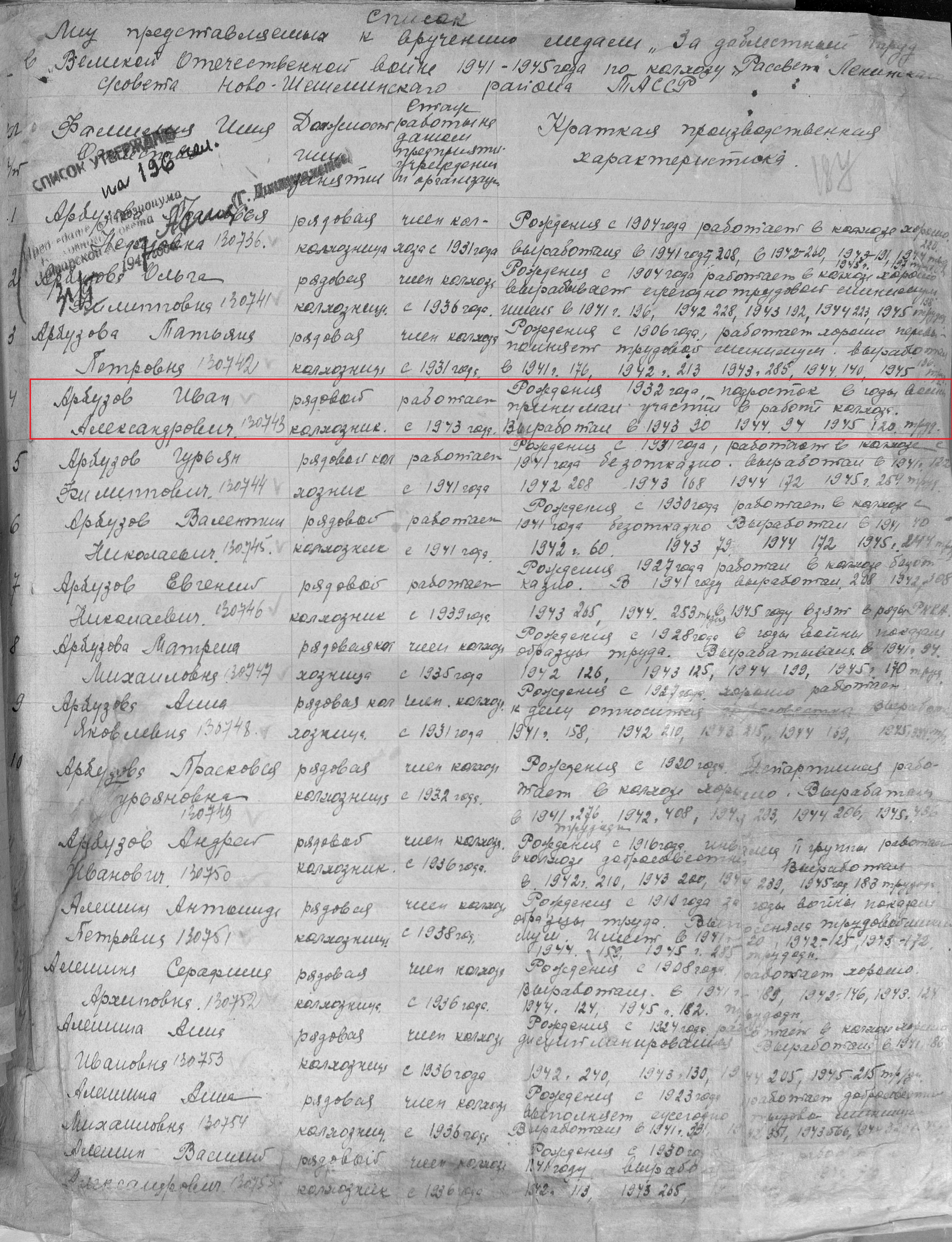 Арбузов Иван Александрович родился в 1932 году в с.Ленино Чистопольского кантона ТАССР. В годы Великой Отечественной войны работал в колхозе "Рассвет" рядовым колхозником. Награжден медалью "За доблестный труд в Великой Отечественной войне 1941–1945 гг." (Акт от 28 апреля 1947г, фонд 3610, опись 2, дело 325, лист 187, № 130743). Умер в 2007 году, похоронен на сельском кладбище с.Тат.Утяшкино.