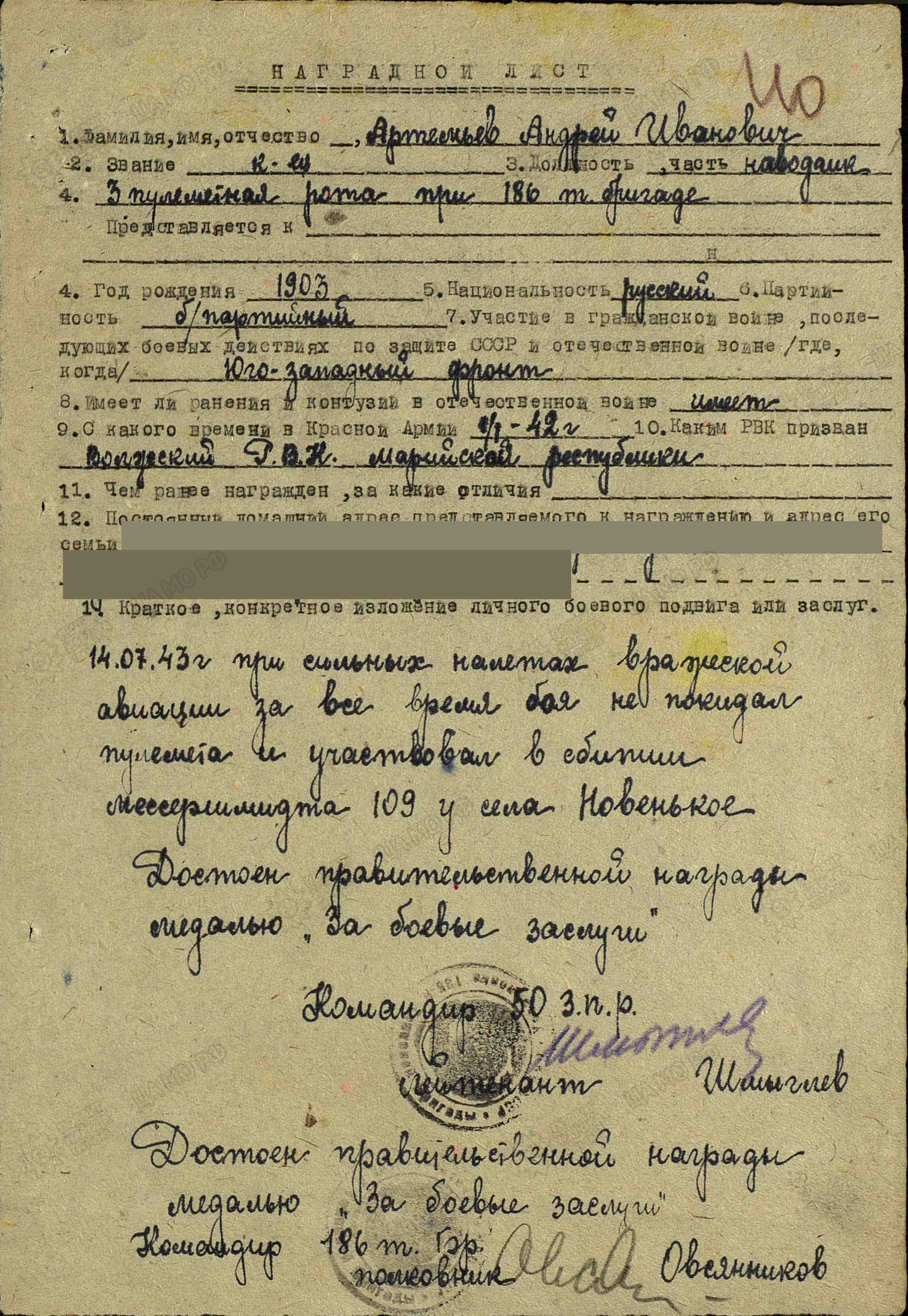 АРТЕМЬЕВ Андрей Иванович, 1903, с. Берёзовая Грива. Мобилизован Волжским РВК МарАССР 1 янв. 1942 г. Красноармеец, наводчик пулемёта пулемётной роты 186 танковой бригады. Воевал на Юго-Западном, 1 Укр. фронтах. Был ранен. 14 июля 1943 г. у с. Новенькое Белгородской обл. во время авианалёта участвовал в уничтожении самолёта Ме-109. Награждён медалью "За боевые заслуги", орденом Отечественной войны 2 ст. (1985г.).
