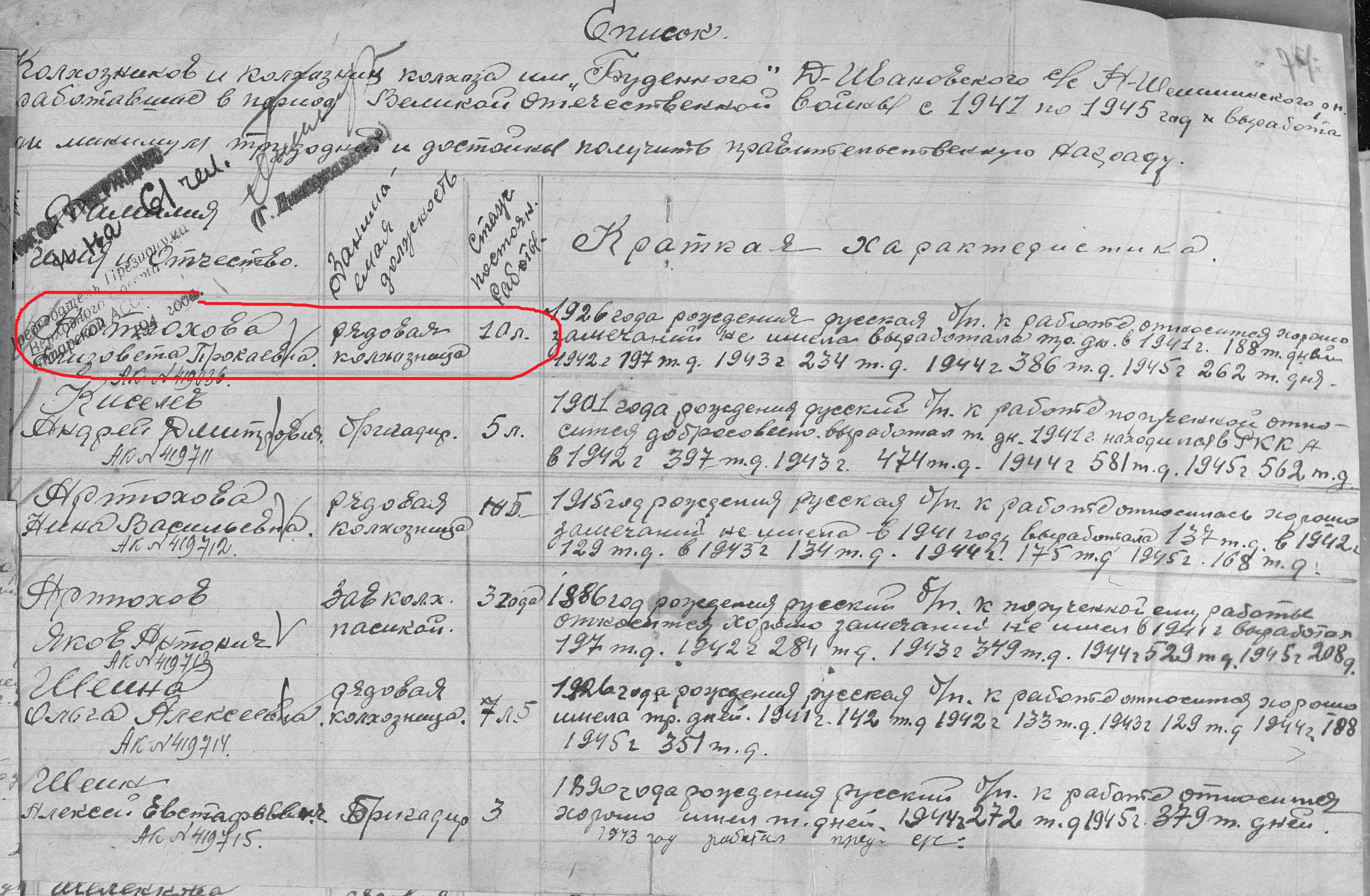 Артюхова Елизавета Прокофьевна родилась в 1926 году. Место жительства: д.Дальняя Ивановка Ново-Шешминский район ТАССР (ныне Альметьевский район РТ). В годы Великой Отечественной войны работала в колхозе им.Буденого рядовой колхозницей. Награждена медалью "За доблестный труд в Великой Отечественной войне 1941–1945 гг." (Акт от 28 апреля 1947 г, фонд 3610, опись 2, дело № 325, лист 74, № 419036).