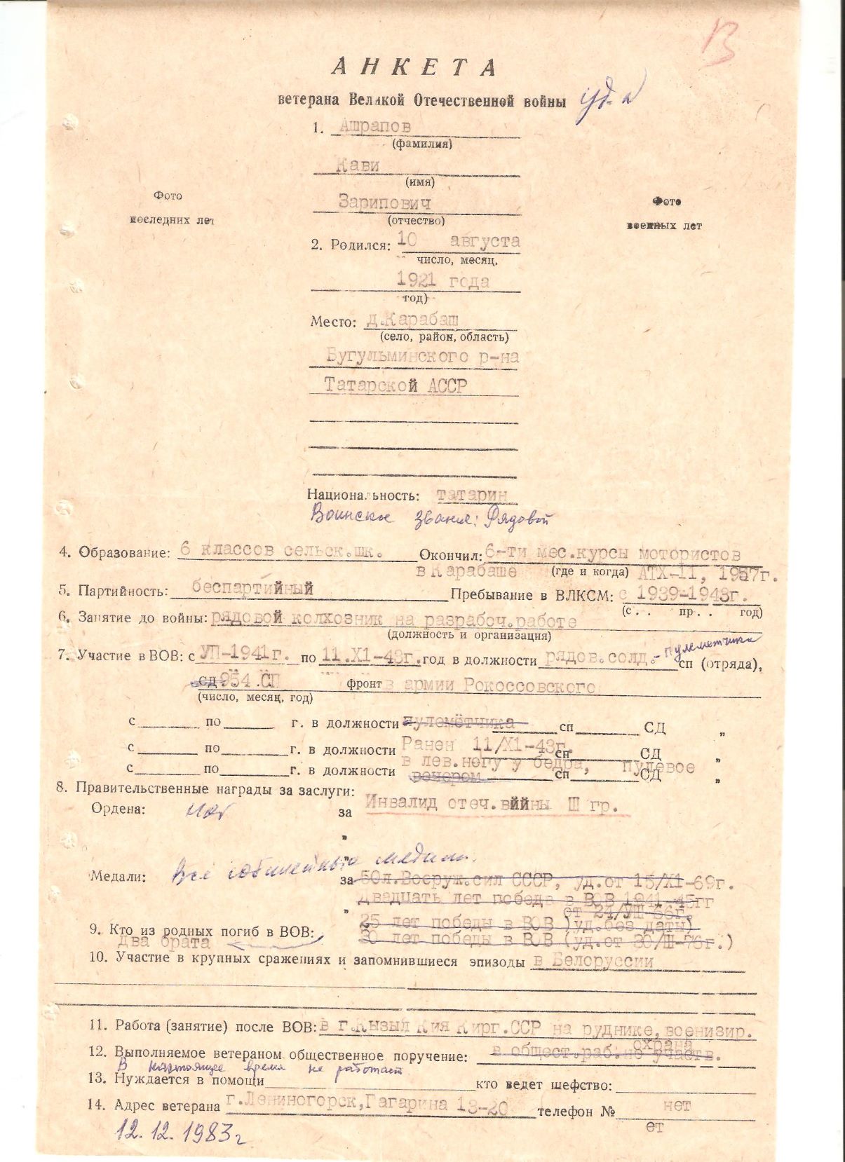 Родился 10 августа 1921 года в д. Карабаш Бугульминского района ТАССР. До войны – колхозник. Рядовой, пулемётчик 954 СП, участник боёв Центрального и Белорусского фронтов, награждён юбилейными медалями. 2 августа 1941 года попал в плен. 11 сентября 1943 года был ранен в бедро левой ноги.