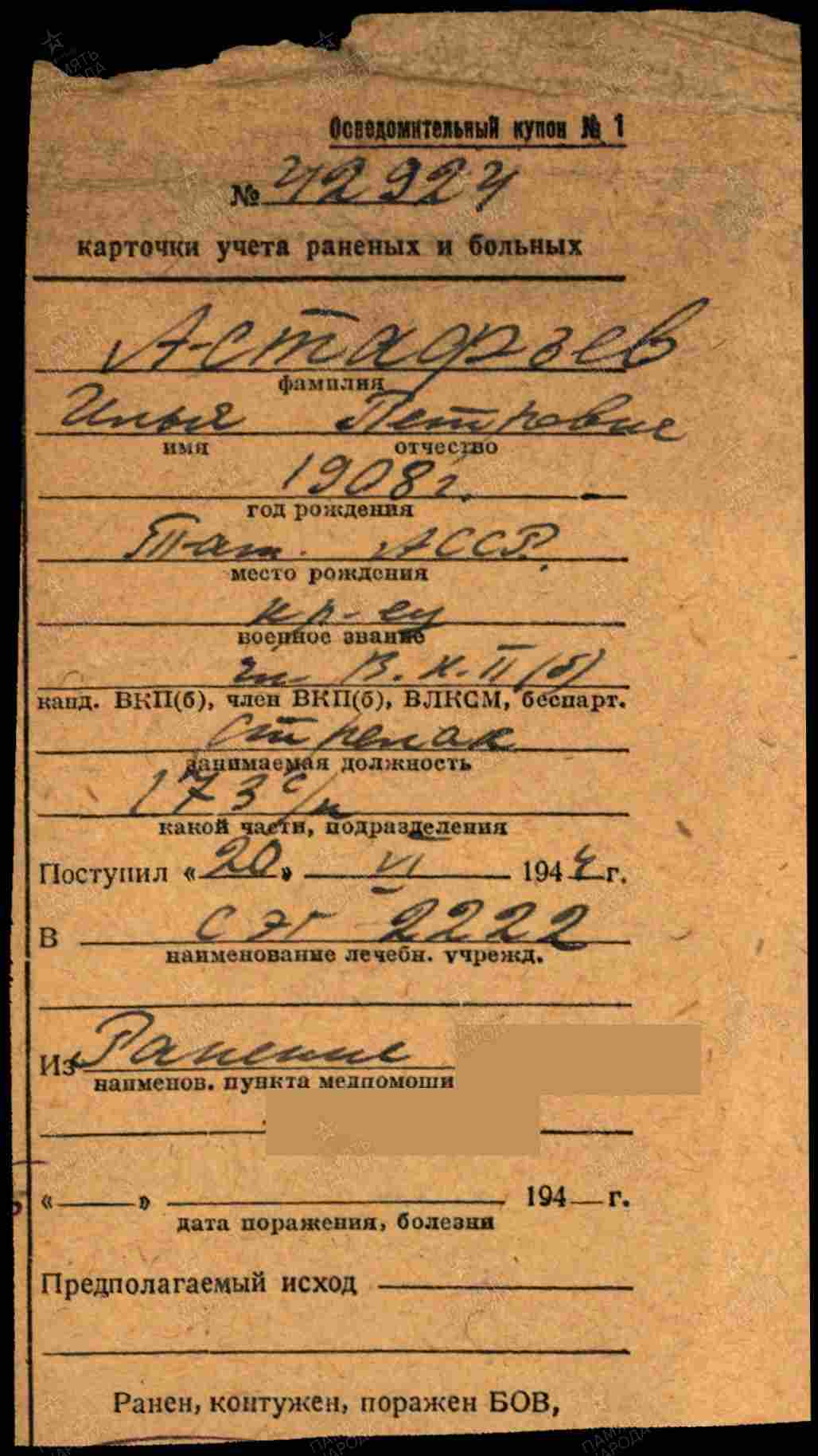 АСТАФЬЕВ Илья Петрович, 1908, д. Верхняя Ия, Высокогорский р-н. Учитель Левашевской школы. Мобилизован Алексеевским РВК в 1941. Член ВКП(б). Красноармеец (ефрейтор), 1082 СП 310 СД, парторг роты 173 СП 90 СД Ленинградского фронта. В боях получил несколько ранений. Награждён медалями «За боевые заслуги», «За отвагу». Тяжело ранен в грудную клетку 17 июня 1944. Умер от ранения 1 июля 1944 в ЭГ 2222. Похоронен на Пискарёвском кладбище, г. Ленинград. Награждён орденом Отечественной войны 2 ст. посмертно.