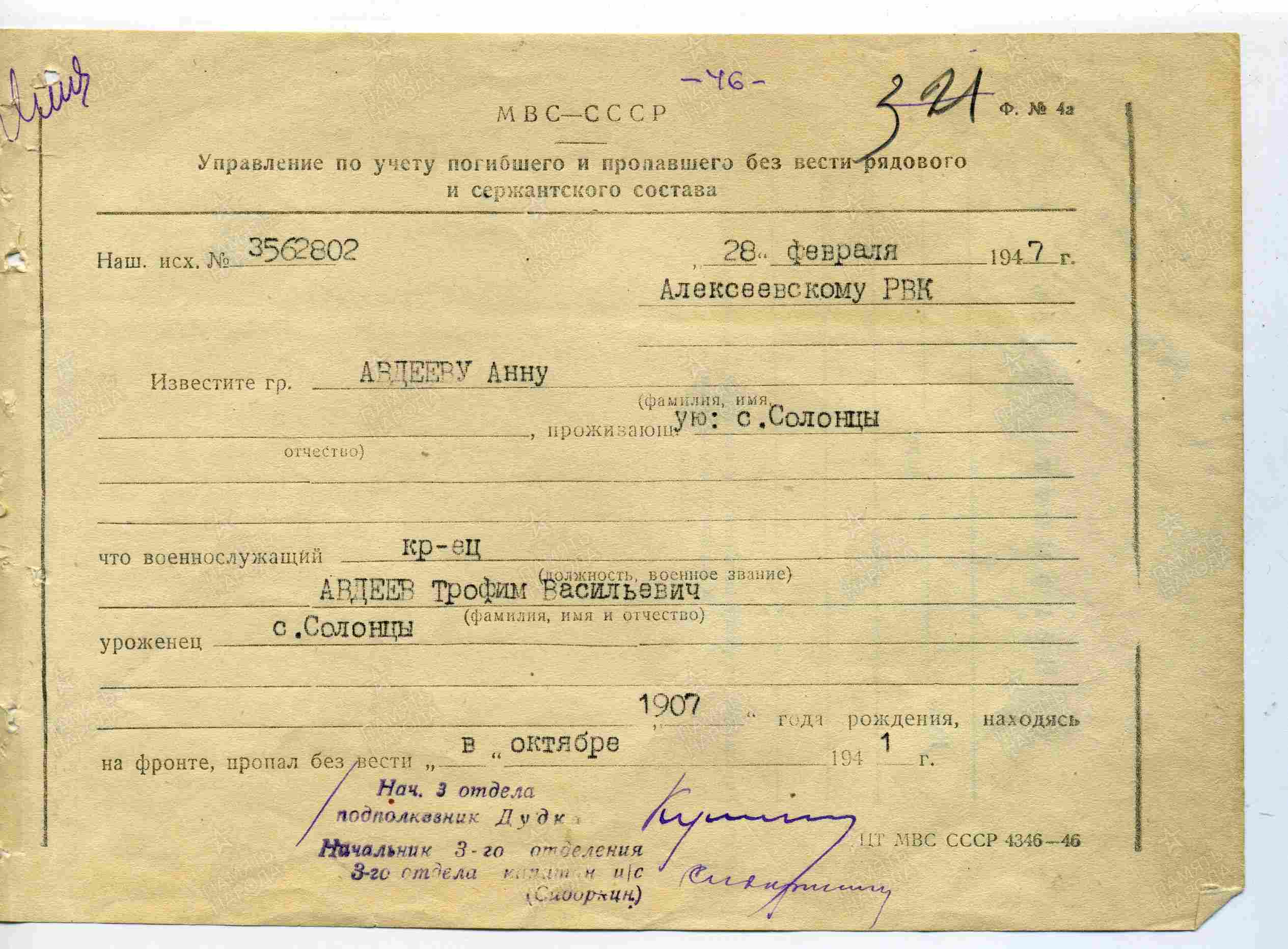 АВДЕЕВ Трофим Васильевич, 1907, д. Солонцы. Мобилизован Алексеевским РВК 25 авг. 1941. Красноармеец. Пропал без вести.