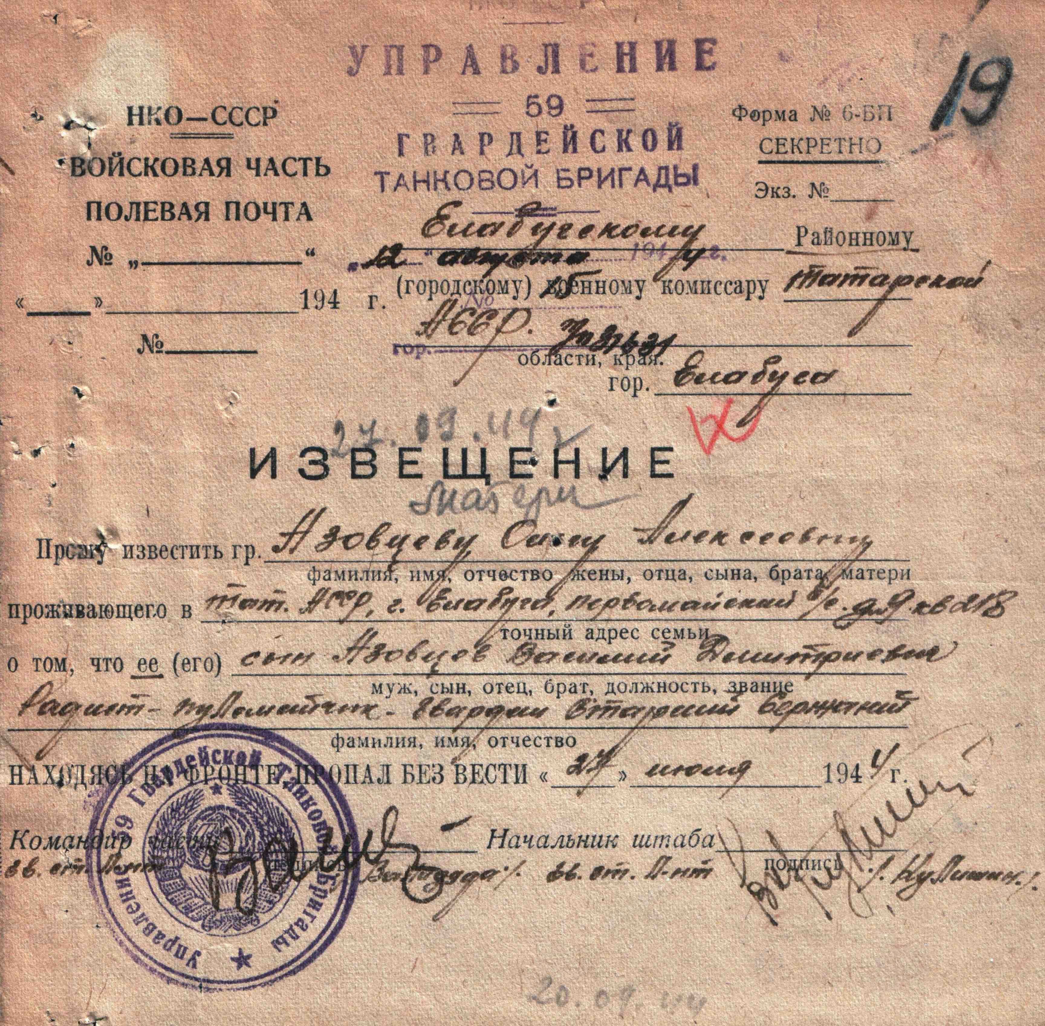 Мобилизован Бондюжским (Елабужским) районным военкоматом.
