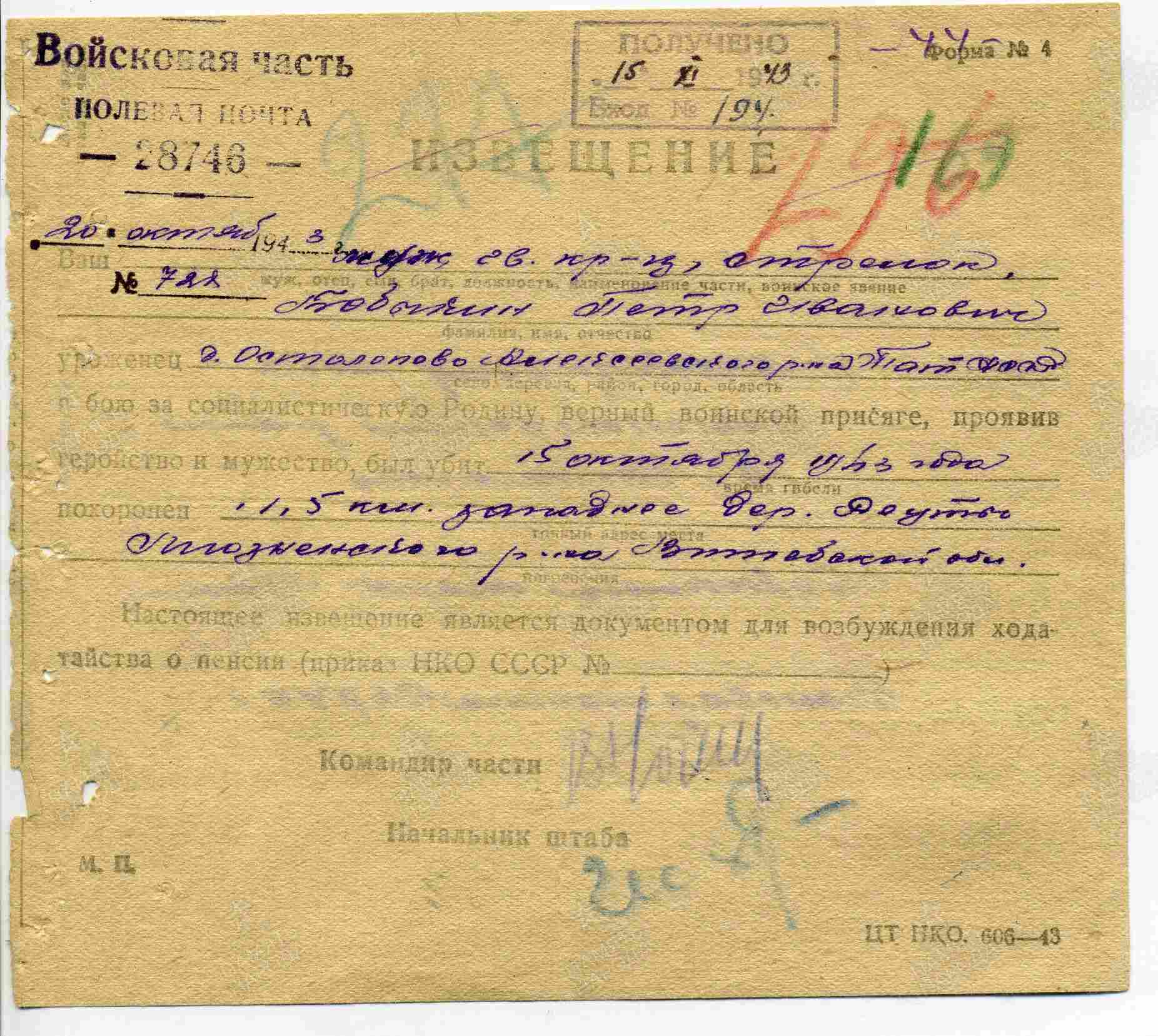 БАБЫКИН Пётр Иванович, 1895, с. Остолопово. Мобилизован Алексеевским РВК 13 нояб. 1941. Красноармеец. Перенёс ранение. В июне 1943 после переосвидетельствования военно-врачебной комиссией признан годным к нестроевой службе. Мобилизован повторно 25 июня 1943. Гв. красноармеец, 279 гв. СП 91 гв. СД 39 А Калининского фронта. Погиб 15 окт. 1943, д. Реуты, Лиозненский р-н, Витебская обл., БелССР.