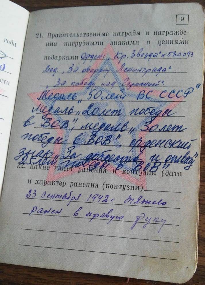 Запись из наградного листа от 20 апреля 1944 года: «Дважды тяжело ранен в боях с превосходящими силами противника в должности стрелка 112 кавалерийского полка. Своими действиями нанес значительный урон противнику в живой силе под Кингисеппом – в ноябре 1941 года и под Воронежем 28.08.1942 года. Несмотря на тяжелые телесные повреждения вследствие ранений – не жалеет сил на дорожно-строительных работах во имя победы над врагом. Дисциплинированный и исполнительный боец. С чувством ответственности за порученное дело – подтягивает в работе отстающих. За боевые дела и самоотверженную работу на армейских буднях достоин представления к награде орденом «Красная Звезда».