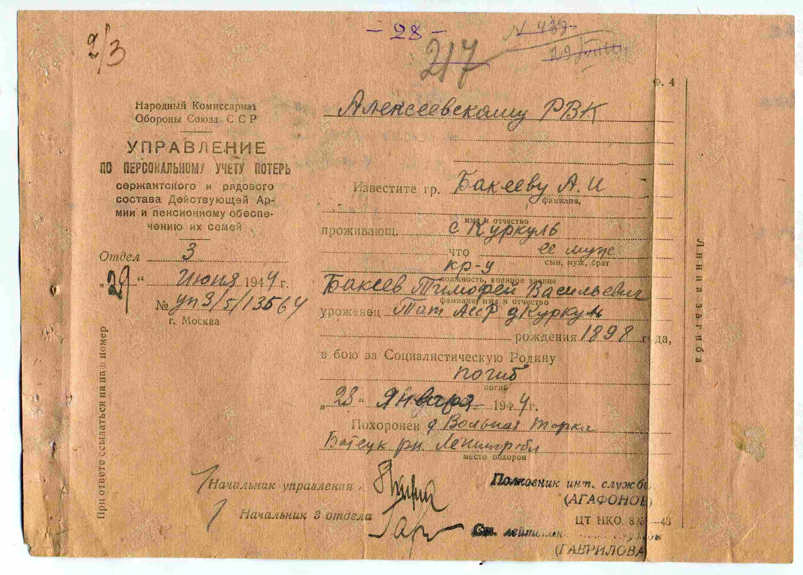 БАКЕЕВ Тимофей Васильевич, 1898, с. Куркуль. Мобилизован Алексеевским РВК 13 нояб. 1941. Красноармеец, 1082 СП 310 СД 59 А Волховского фронта. Погиб 28 янв. 1944, Новгородская обл., Батецкий р-н, д. Жестяная (Вольная) Горка.