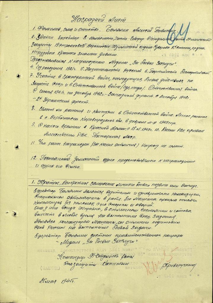 БАЛЯЛИН Алексей Павлович, 1921, с. Караваево. Мобилизован Алексеевским РВК в 1940. На фронте с июня 1941 (Западный фронт), в дальнейшем воевал на 2 Укр. фронте. Ефрейтор, шофёр, командир спецмашины 91 отдельной роты химической защиты 19 стрелковой дивизии. В феврале 1943 в Кировоградской обл. был легко ранен. Награждён медалями "За боевые заслуги", "За победу над Германией". После войны работал комбайнером в Ромодановской МТС. Скончался в 1983, похоронен в с. Караваево.