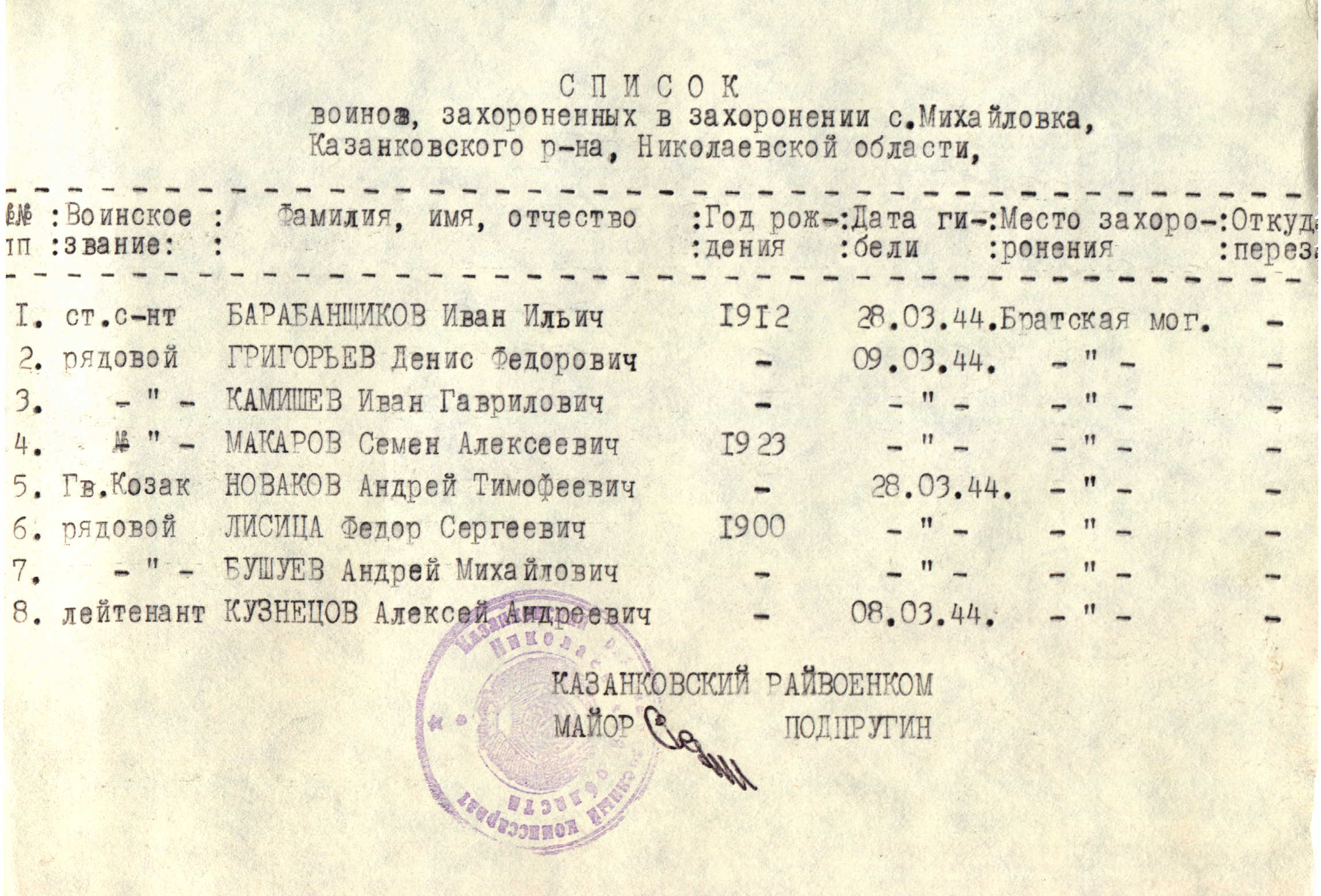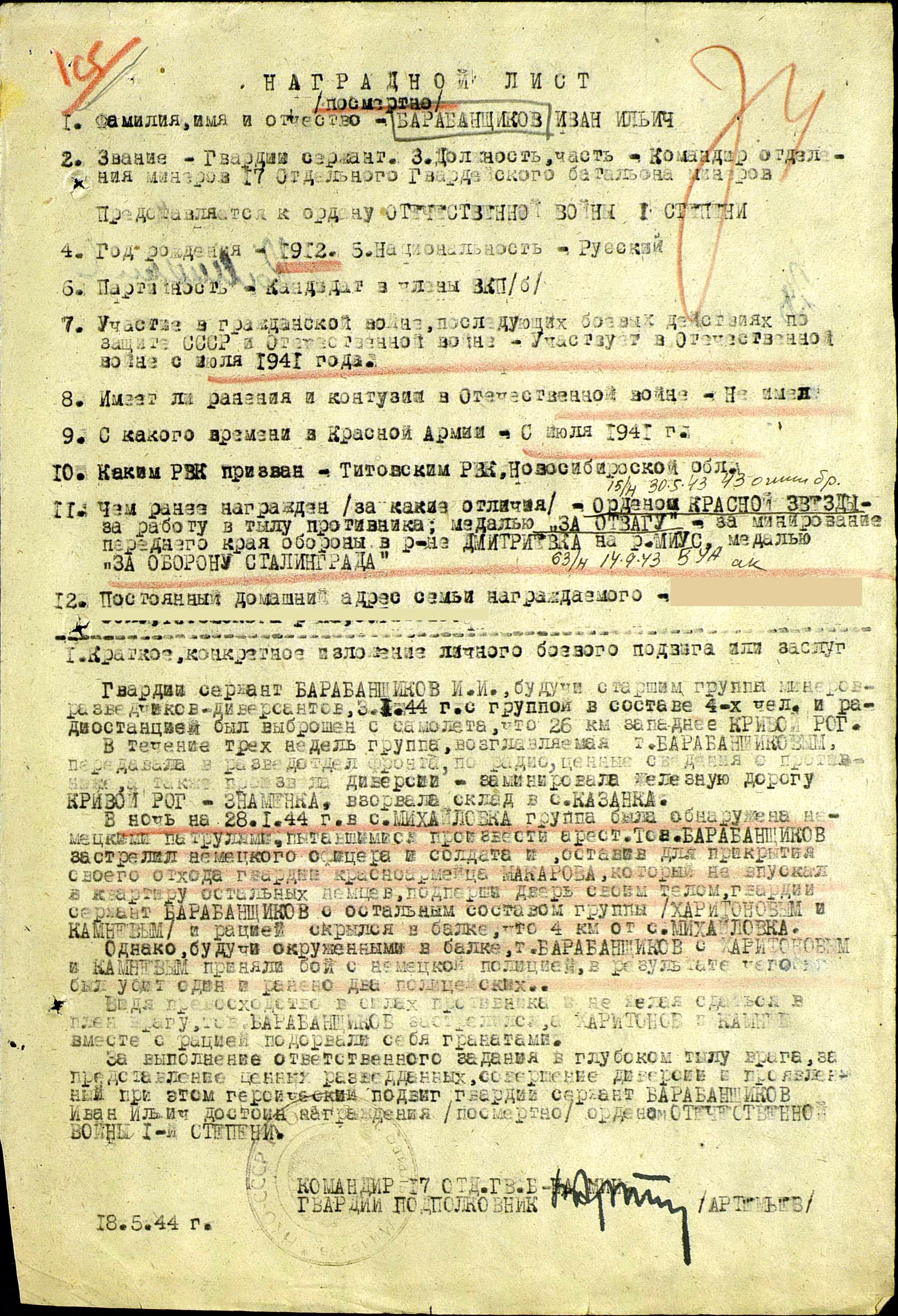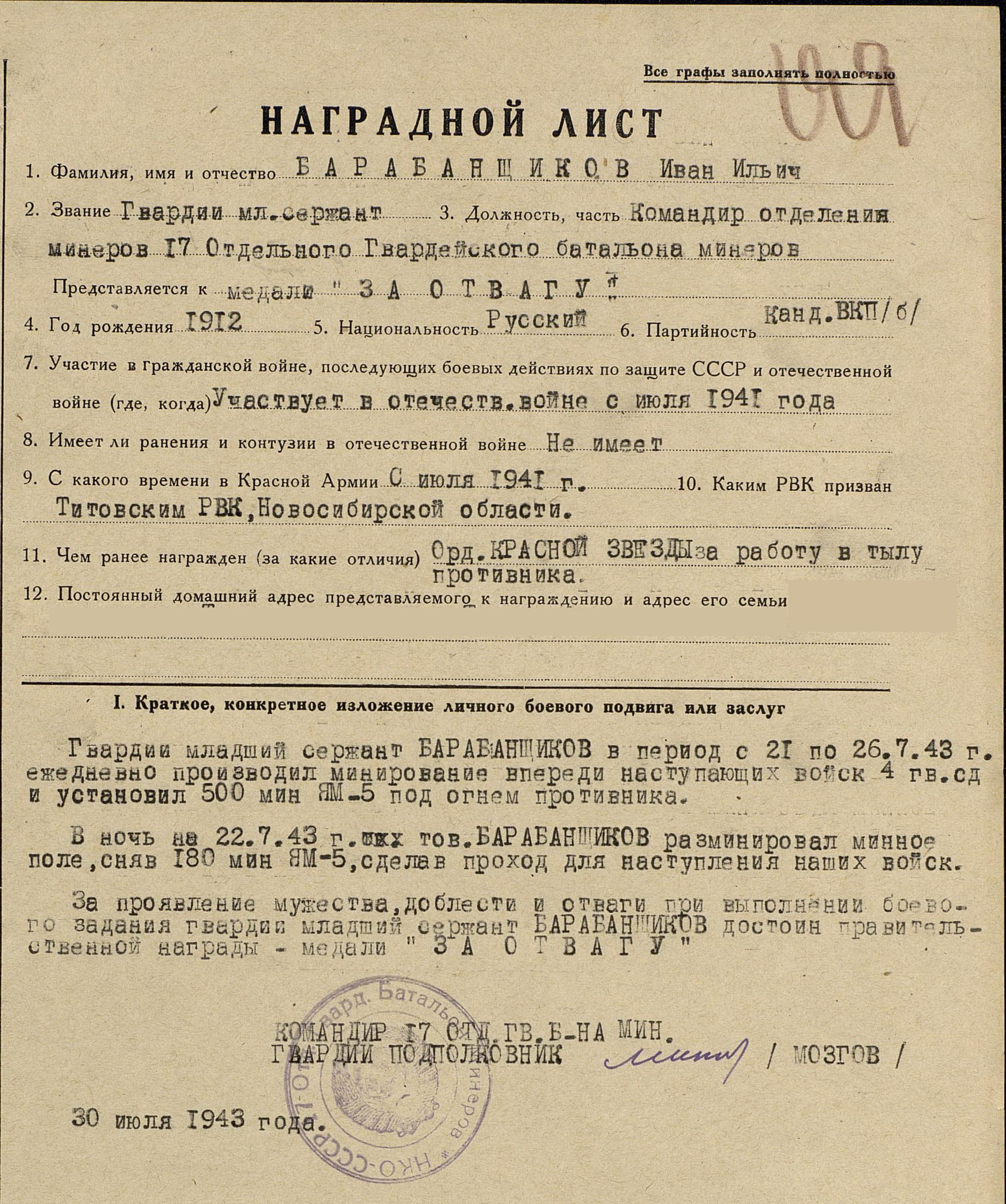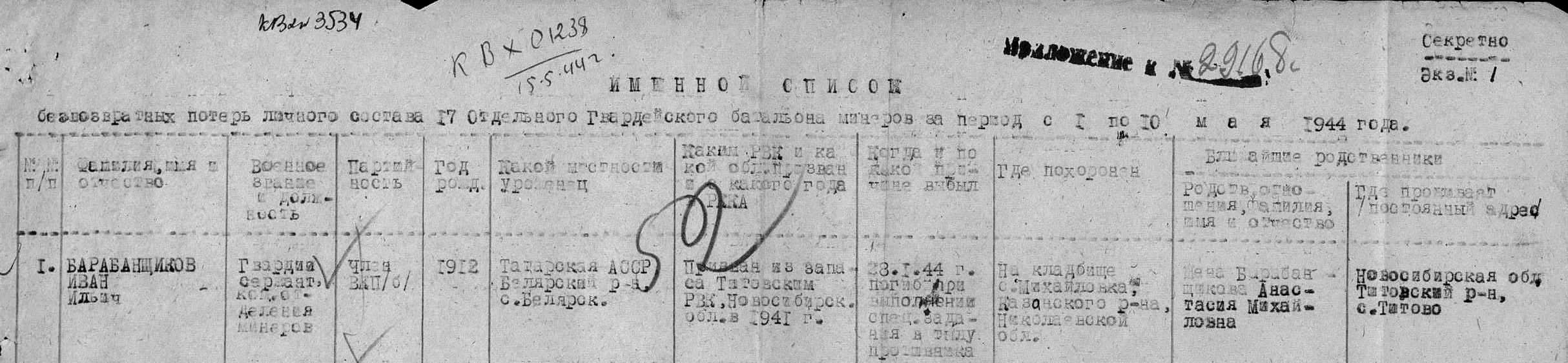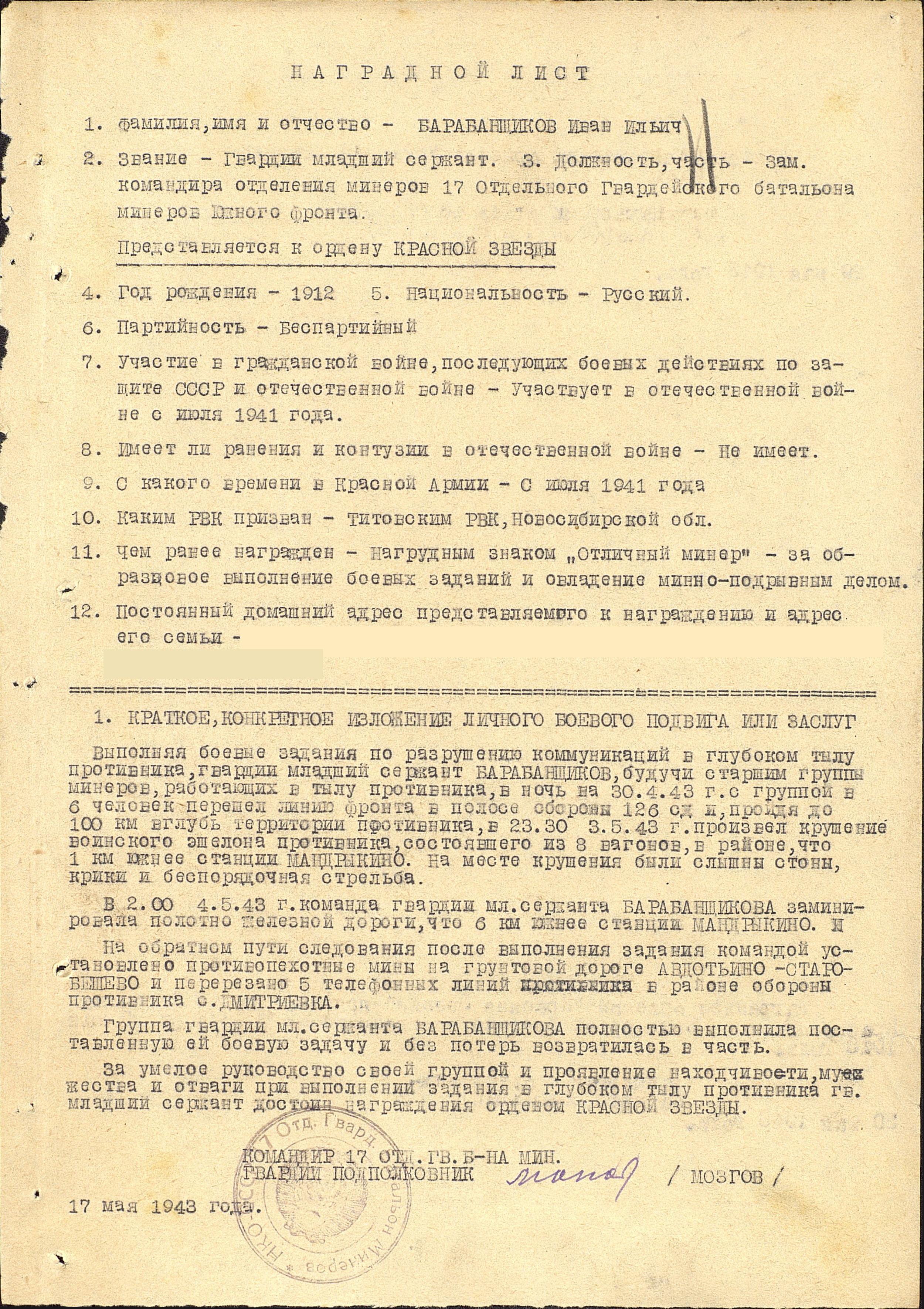 Иван Ильич Барабанщиков родился в 1912 г. в с. Билярск Чистопольского уезда Казанской губернии. Перед Великой Отечественной войной проживал в Новосибирской области. Мобилизован на фронт Титовским РВК в 1941 г. Принимал участие в битве за Сталинград, награждён медалью. В 1943 г. - гв. мл. сержант, зам командира отделения минёров 17 отдельного гвардейского батальона минёров Южного фронта. Награждён знаком "Отличный минёр" за образцовое выполнение боевых заданий и овладение минно-подрывным делом. Выполняя боевые задания по разрушению коммуникаций в глубоком тылу противника, будучи старшим в группе минёров из 6 человек 30 апреля 1943 г. перешёл линию фронта в полосе обороны 126 стрелковой дивизии, пройдя по тылам проивника около 100 км. 3 мая 1943 г. в районе ст. Мандрыкино произвёл подрыв и крушение вражеского эшелона из 8 вагонов. 4 мая 1943 г. группа Барабанщикова произвела минирование ж\д полотна в 6 км. от той же станции, минирование противопехотными минами грунтовой дороги, перерезала 5 телефонных линий противника в районе с. Дмитриевка. Группа без потерь вернулась в своё расположение. За этот подвиг Барабанщиков был удостоен ордена Красная Звезда. С 21 по 26 июля 1943 г. гв. мл. сержант Барабанщиков производил минирование переднего края в полосе 4 гв. стр. дивизии под огнём противника, установив 500 мин ЯМ-5. В ночь на 22 июля разминировал проход в полосе наступления наших войск, сняв 180 мин ЯМ-5. За боевую работу награждён медалью "За отвагу". В 1944 г. - гв. сержант, командир отделения минёров 17 ОГвБМ. 3 января 1944 г. будучи старшим группы минёров разведчиков-диверсантов из 4-х человек был выброшен с самолёта на парашютах с радиостанцией в 26 км. западнее г. Кривой Рог. В течение трёх недель группа Барабанщикова передавала в разведотдел фронта по радио ценные сведения о противнике, а также производила диверсии - заминировала железную дорогу Кривой Рог-Знаменка, взорвала склад в с. Казанка. В ночь с 28 января 1944 г. в с. Михайловка группа была обнаружена немецкими патрулями, пытавшимися произвести её арест. Тов. Барабанщиков застрелил немецкого офицера и солдата, оставив для прикрытия своего отхода гв. красноармейца Макарова, с остальным составом, гв. красноармейцами Харитоновым и Камневым, и рацией скрылся в балке в 4км от с. Михайловка, где принял бой в окружении с немецкой полицией, убив одного и ранив двоих полицейских. Не желая сдаваться превосходящим силам врага, тов. Барабанщиков застрелился, а Харитонов и Камнев вместе с рацией подорвали себя гранатами. За проявленный подвиг гв. с-т Барабанщиков награждён орденом Отечественной войны 1 ст. посмертно.