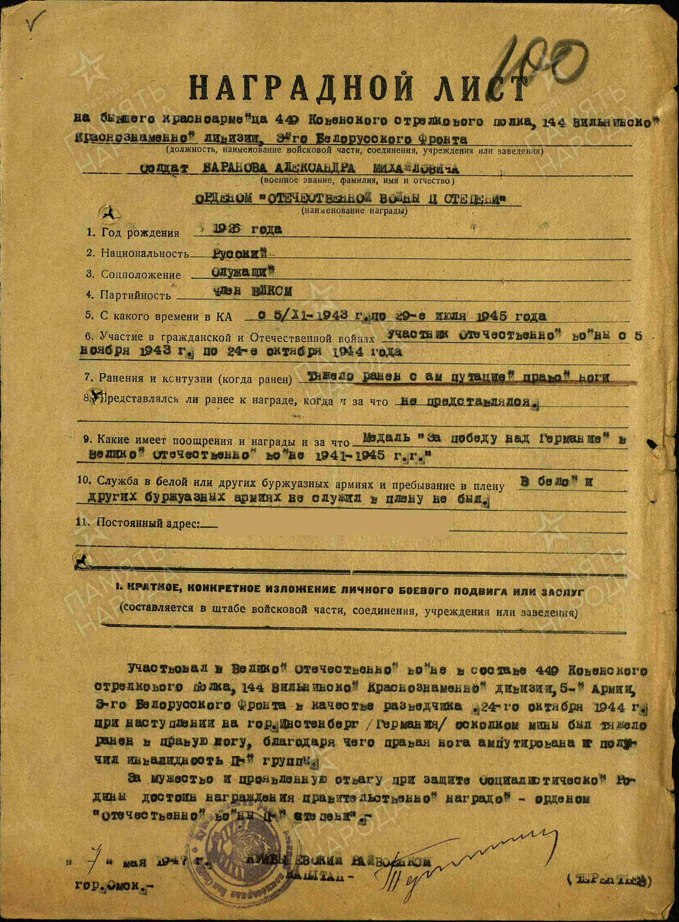БАРАНОВ Александр Михайлович, 1926, с. Масловка. Член ВЛКСМ. Мобилизован 5 нояб. 1943 Куйбышевским РВК г. Омск. Ефретор, разведчик взвода пешей разведки 449 СП 144 СД 5 А 3 Белорусского фрнота. Тяжело ранен принаступлении в р-не г. Инстенбург, 24 окт. 1944 осколком мины в правую ногу с ампутацией. Демобилизован 29 июля 1945 с инвалидностью 2 гр. Награждён медалью «За отвагу», орденами Отечественной войны 2 ст. (1947), 1 ст. (1985).