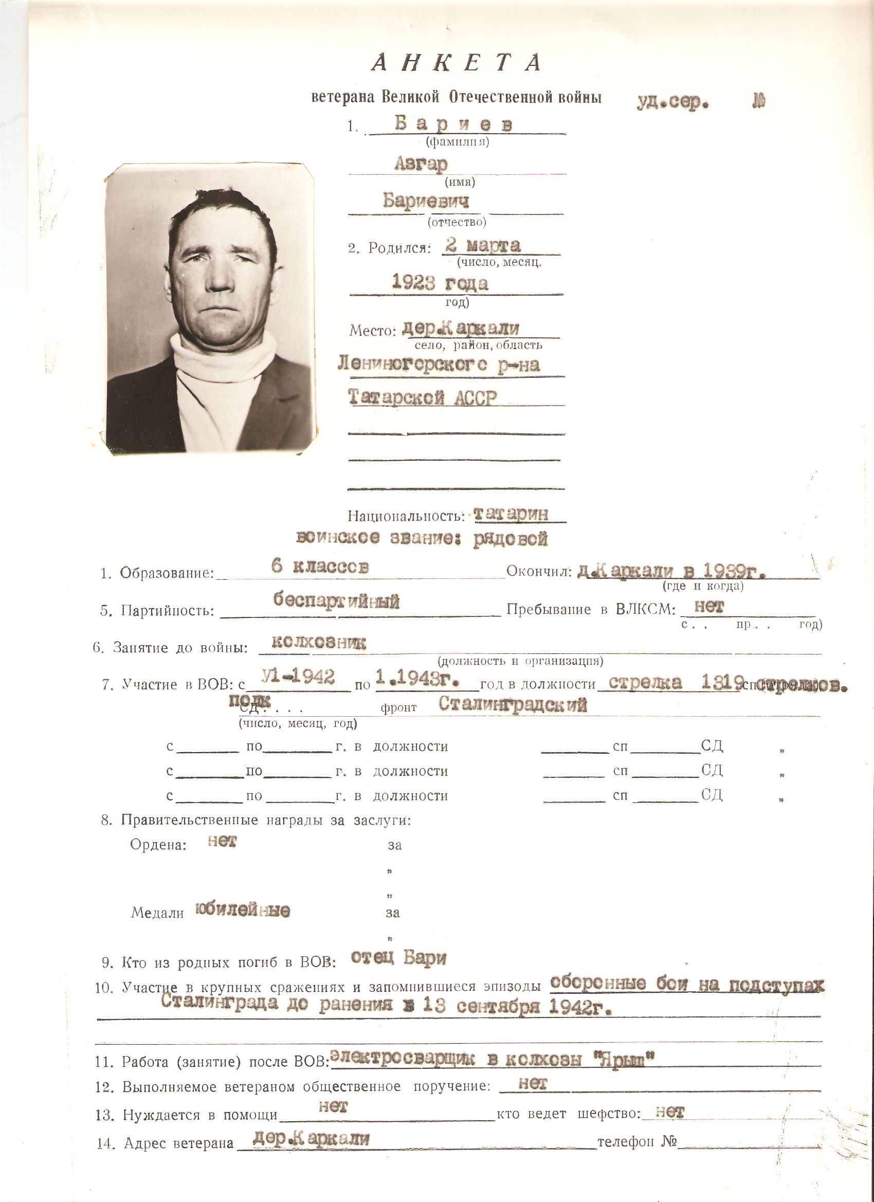 Родился 2.03.1923г. в с.Каркали, ныне Лениногорский район РТ. До войны колхозник.