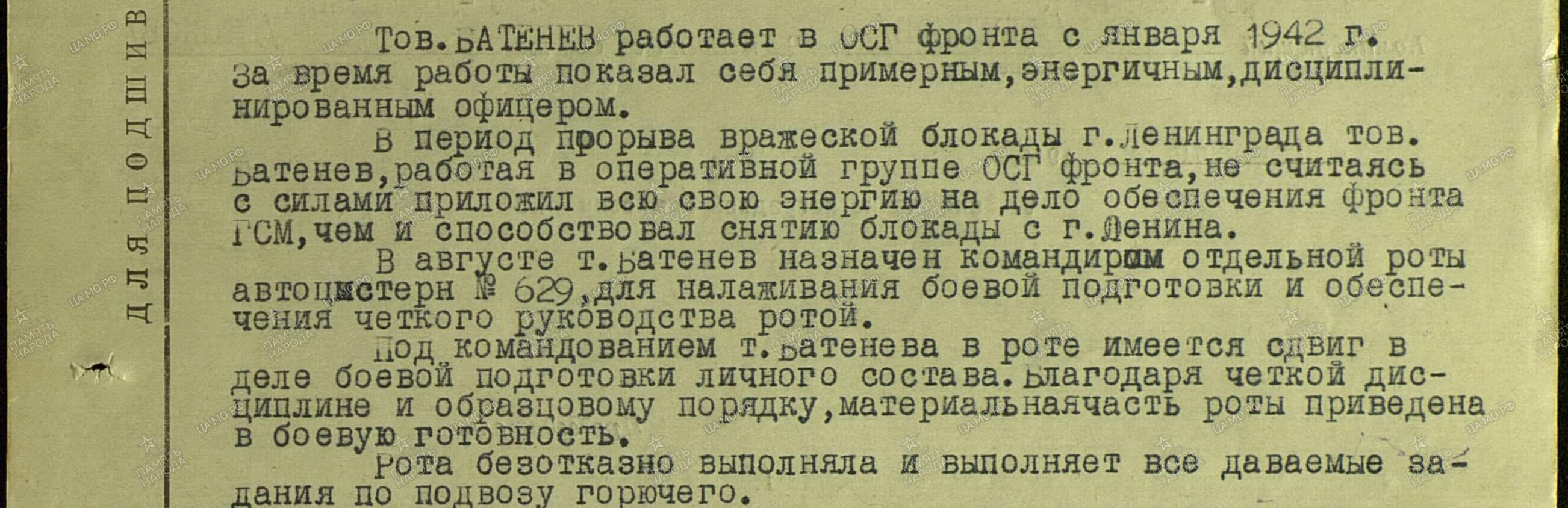 Капитан Батенев за короткий период образцово поставил работу. Состояние материальной части и дисциплина в роте отличная. Все задания командования по подвозу горючего войскам выполняет беспрепятственно и в срок. Количество аварий и поломок сведено к нулю. Батенев - энергичный и грамотный офицер, пользуется авторитетом среди офицерского состава и подчиненных.