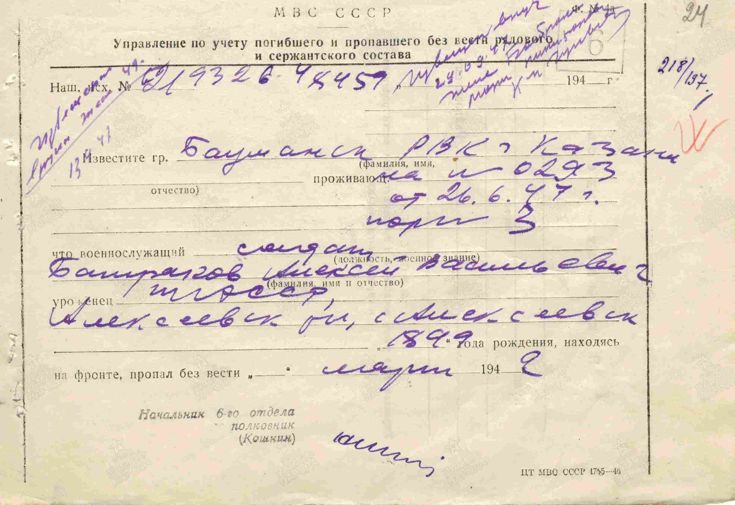 БАТРАКОВ Алексей Васильевич, 1899, с. Алексеевское. Мобилизован Алексеевским РВК в авг. 1941. Красноармеец. Пропал без вести.