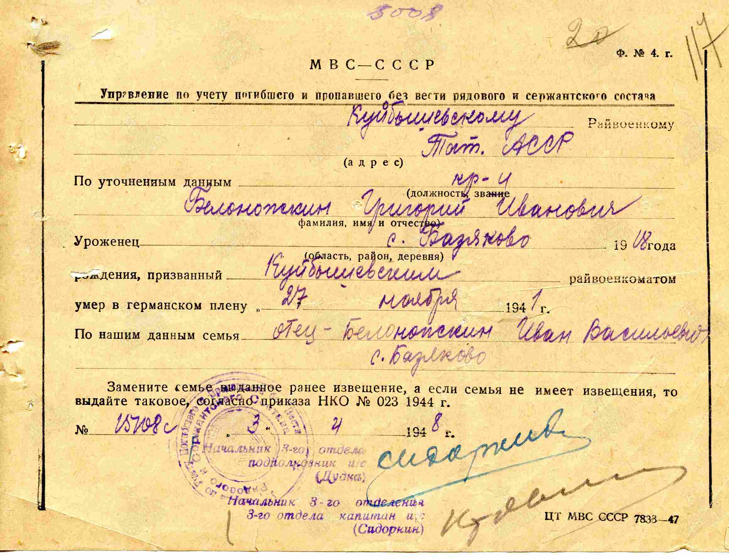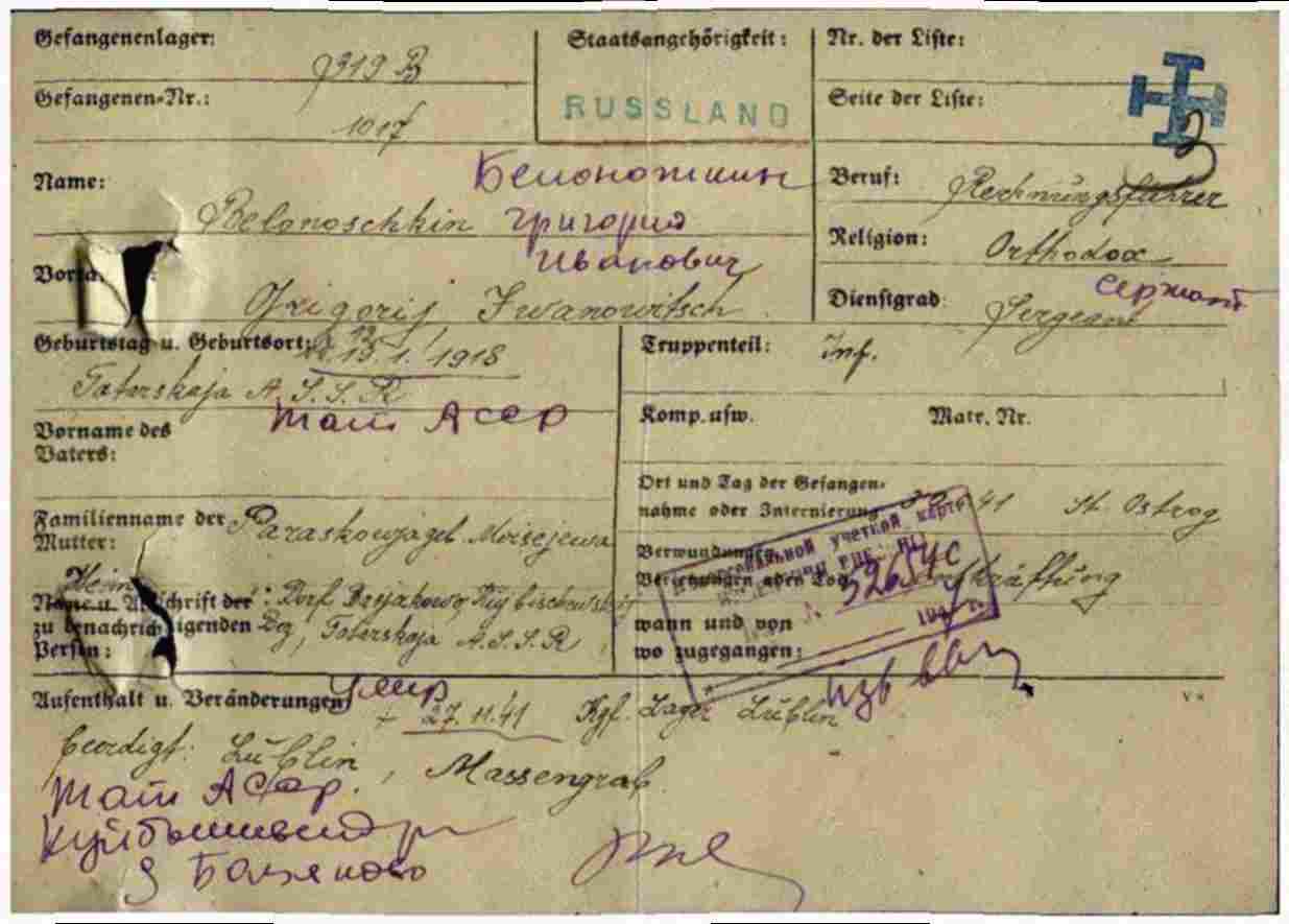БЕЛОНОЖКИН Григорий Иванович, 1918, с. Базяково. Мобилизован Куйбышевским РВК 4 окт. 1939. Сержант. Служил на Западной Украине. Попал в плен 30 июня 1941 в р-не г. Острог, Ровенская обл. Содержался в лагере военнопленных № 319, г. Хелм, Люблинское воеводство, Польша. Умер 27 нояб. 1941.