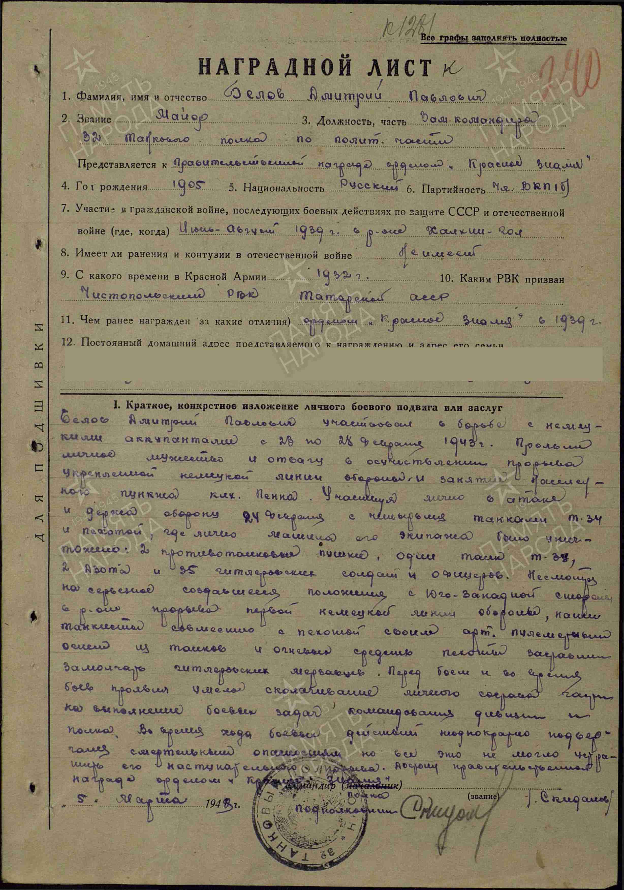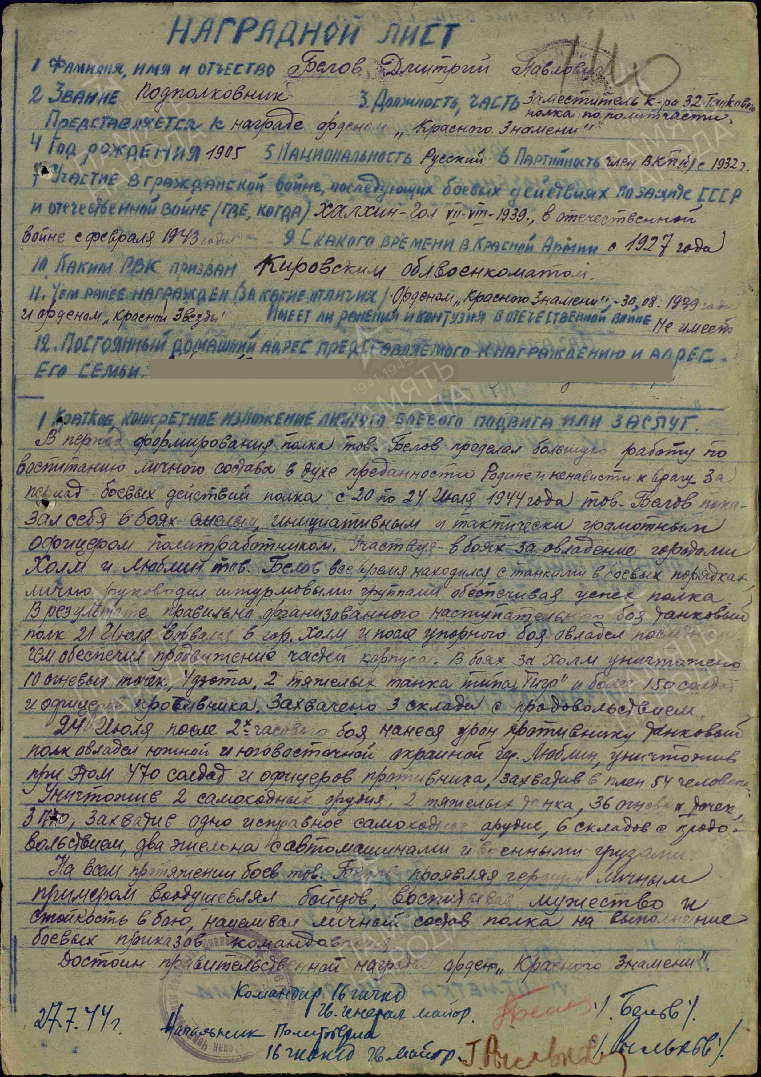 БЕЛОВА Дмитрий Павлович, 1905, д. Малый Красный Яр. В Красной Армии с 24 окт. 1927, с 1932 – член ВКП(б), политрук. В июле-авг. 1939 принмал участие в боях на р. Халхин-Гол в составе 7 моторизованной бронебригады. Награждён орденом Красного Знамени. Мобилизован Кировским ОблВК. Участник войны с фев. 1943, майор/подполковник/полковник, зам. ком. полка по полит. части 32 ТП 27 А Северо-Западного фронта, 16 гв. КавД 1 Белорусского фронта. После войны окончил военную академию БТ и МВ им. В.И. Сталина. Награждён орденами Красной Звезды (1943), Отечественной войны 1 ст. (1944), Красного Знамени (1950), медалями «За боевые заслуги», «За освобождение Варшавы», «30 лет Халкин-Гольской победы» (МНР, 1969).
