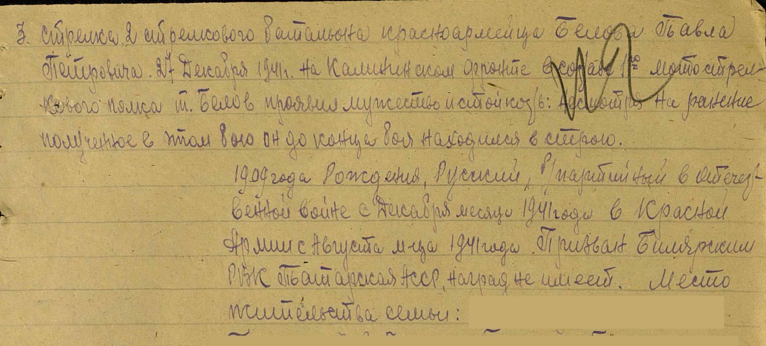 БЕЛОВ Павел Петрович, 1909, с. Большие Полянки. Мобилизован Билярским РВК в 1941 г. Красноармеец 1 мотострелкового полка. Воевал на Калининском фронте. 27 декабря 1941 г. в бою получил ранение, но не покинул поле боя. В 1944 г. за проявленное мужество был награждён медалью "За отвагу". Далее - сержант, пом. ком. взвода 189 стр. полка 329 СД 1 Укр. фронт. 3 августа 1944 г. при форсировании реки Сан заменил выбывшего командира взвода и вместе с подразделением первым форсировал реку, занял огневой рубеж, чем обеспечил успешную переправу своей роты. 8 августа 1944 г. при подготовке переправы через р. Висла (Польша) был убит. Посмертно награждён орденом Отечественной войны 2 ст.