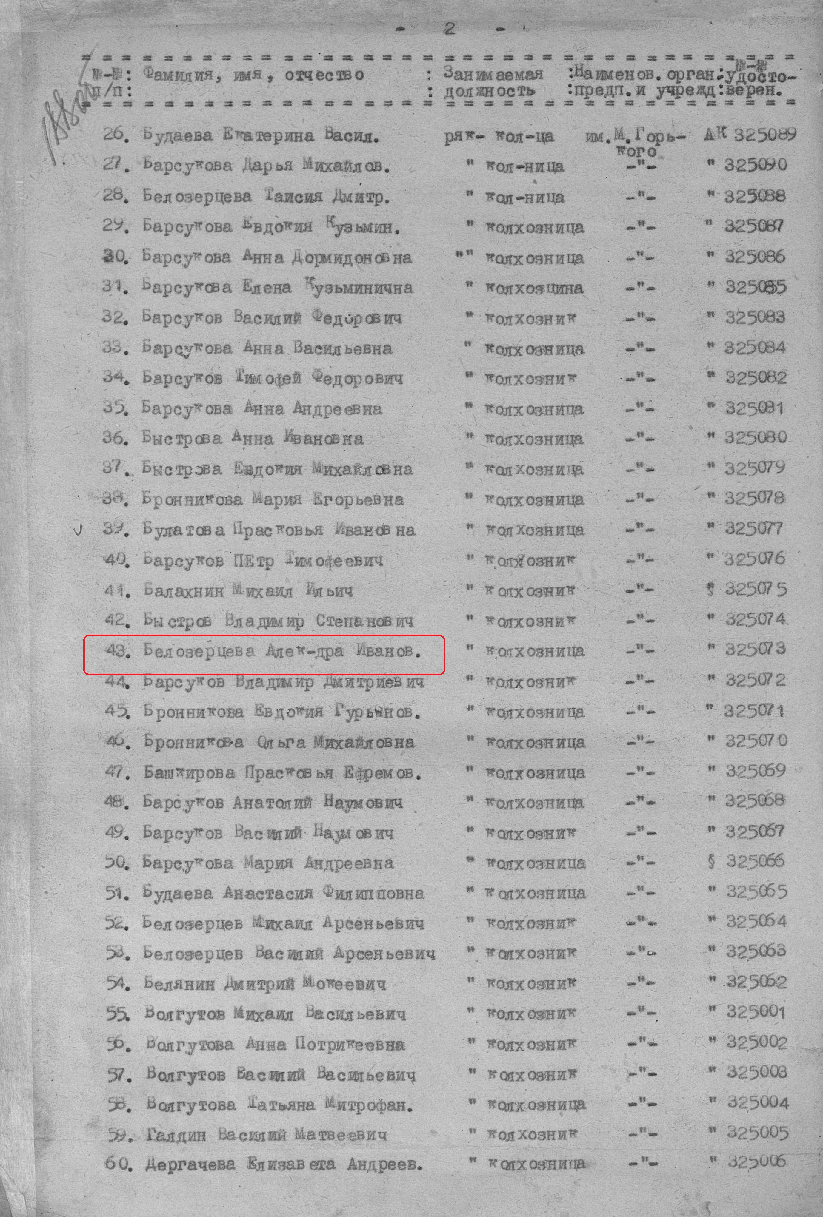 Белозерцева Александра Ивановна. Место жительства: с.Сл.Арханегельская Ново-Шешминский район ТАССР. В годы Великой Отечественной войны работала в колхозе им. Горького рядовой колхозницей. Награждена медалью "За доблестный труд в Великой Отечественной войне 1941–1945 гг." (Акт от 20 февраля 1946г., Фонд 3610, опись 2, дело № 470, лист 188, №325073).