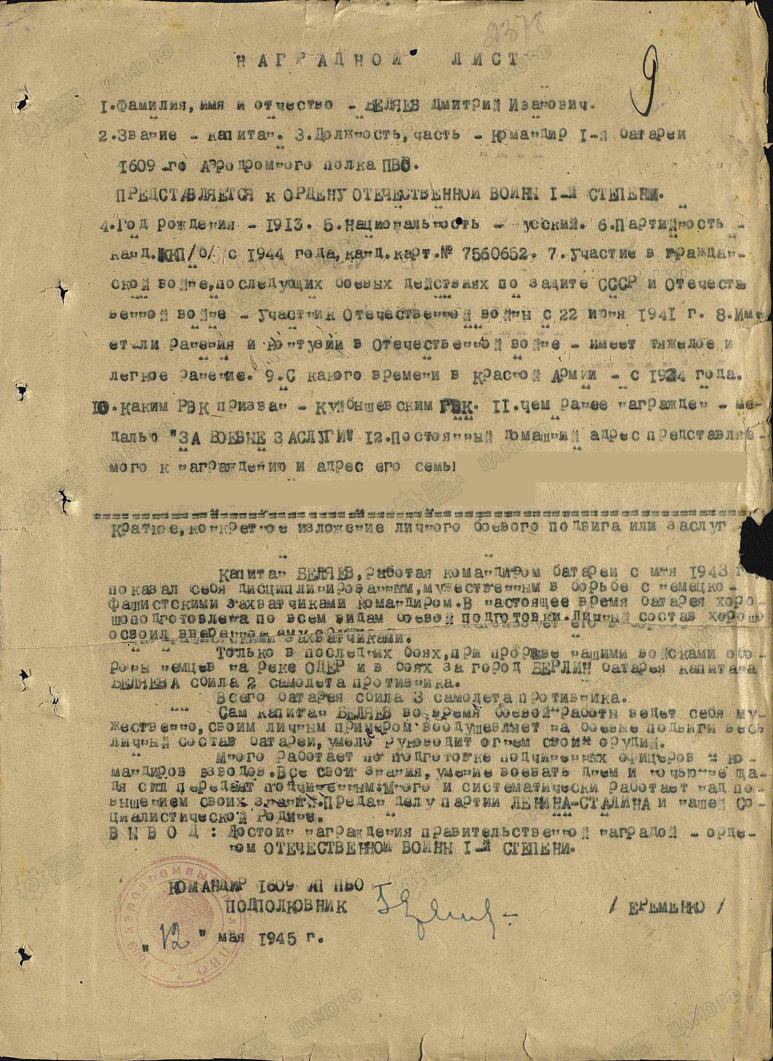 БЕЛЯЕВ Дмитрий Иванович, 1913, с. Базяково. Мобилизован Куйбышевским РВК в 1934 г. На фронте с 1941 г. Участник боёв за Кавказ. В боях на 1 Белорусском фронте был тяжело и легко ранен. В 1945 г. - капитан, командир батареи 1609 аэродромного полка ПВО 16 Воздушной Армии. В боях на Одере и за Берлин батарея Беляева сбила 2 самолёта противника (всего 3). Награждён медалью "За боевые заслуги" (1944), медалью "За оборону Кавказа", орденами Отечественной войны 1 ст. (1945) и 2 ст. (1985).