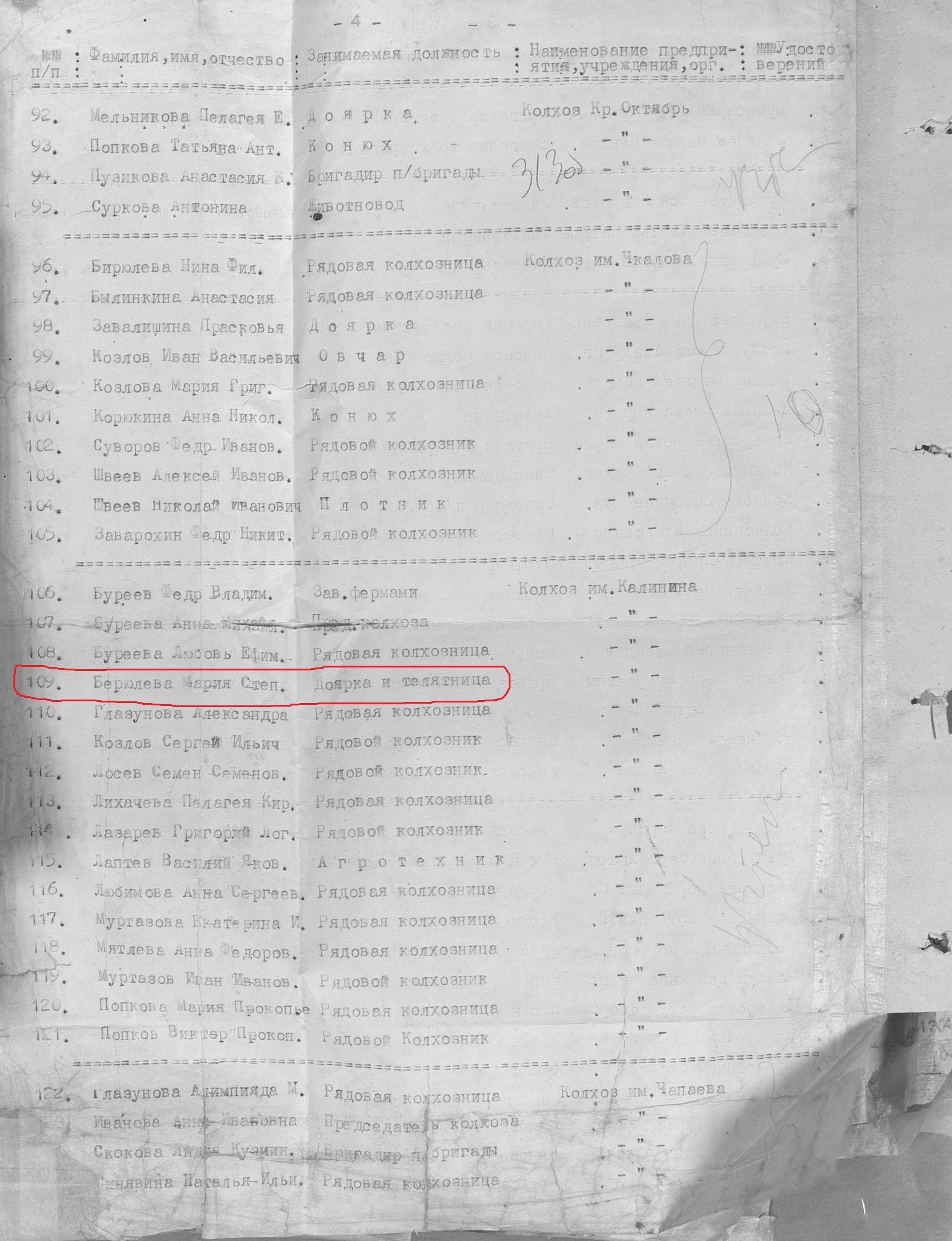 Берюлева Мария Степановна родилась в 1903 году в п.Сосновка Казанской губернии Чистопольского уезда Новошешминской волости. В годы войны работала в колхозе им.Калинина дояркой. Награждена медалью "За доблестный труд в Великой Отечественной войне 1941–1945 гг." (Акт от 28 апреля 1947 г, фонд 3610, опись 2, дело № 325, лист 313).