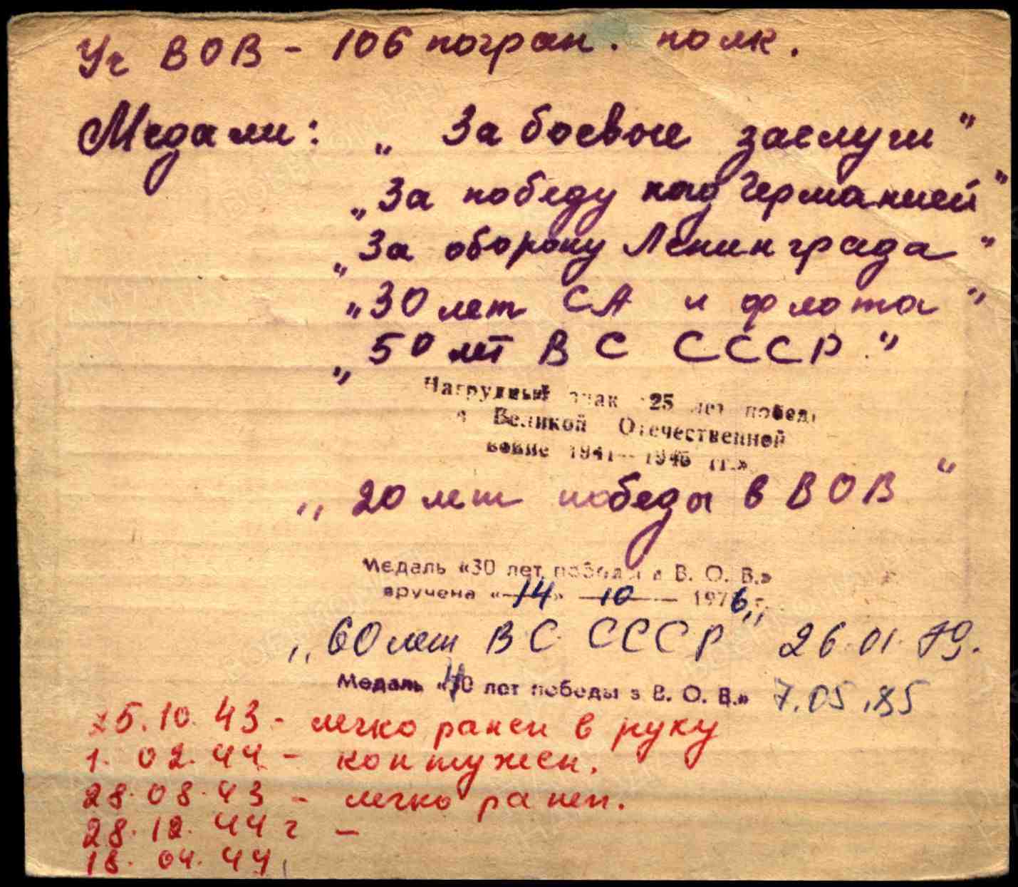 Принимал участие в снятии блокады города Ленинграда. После снятия блокады был переведен в пограничные войска, в Западную Украину, в Карпаты для борьбы с бандэровцами. Очень хорошо дед запомнил битву в Курской области, близ города Севска. Там же он был ранен. После войны в 1953 году мой дед начал работать председателем Сельского совета. Был избран председателем Сельпо в селе Кузайкино Альметьевского района в 1954 1955 гг. Позже, в городе Лениногорске, работал заместителем начальника ЖБИ, а также последние годы работал заместителем главного врача Административной хозяйственной части. И в 1985 году вышел на пенсию.»