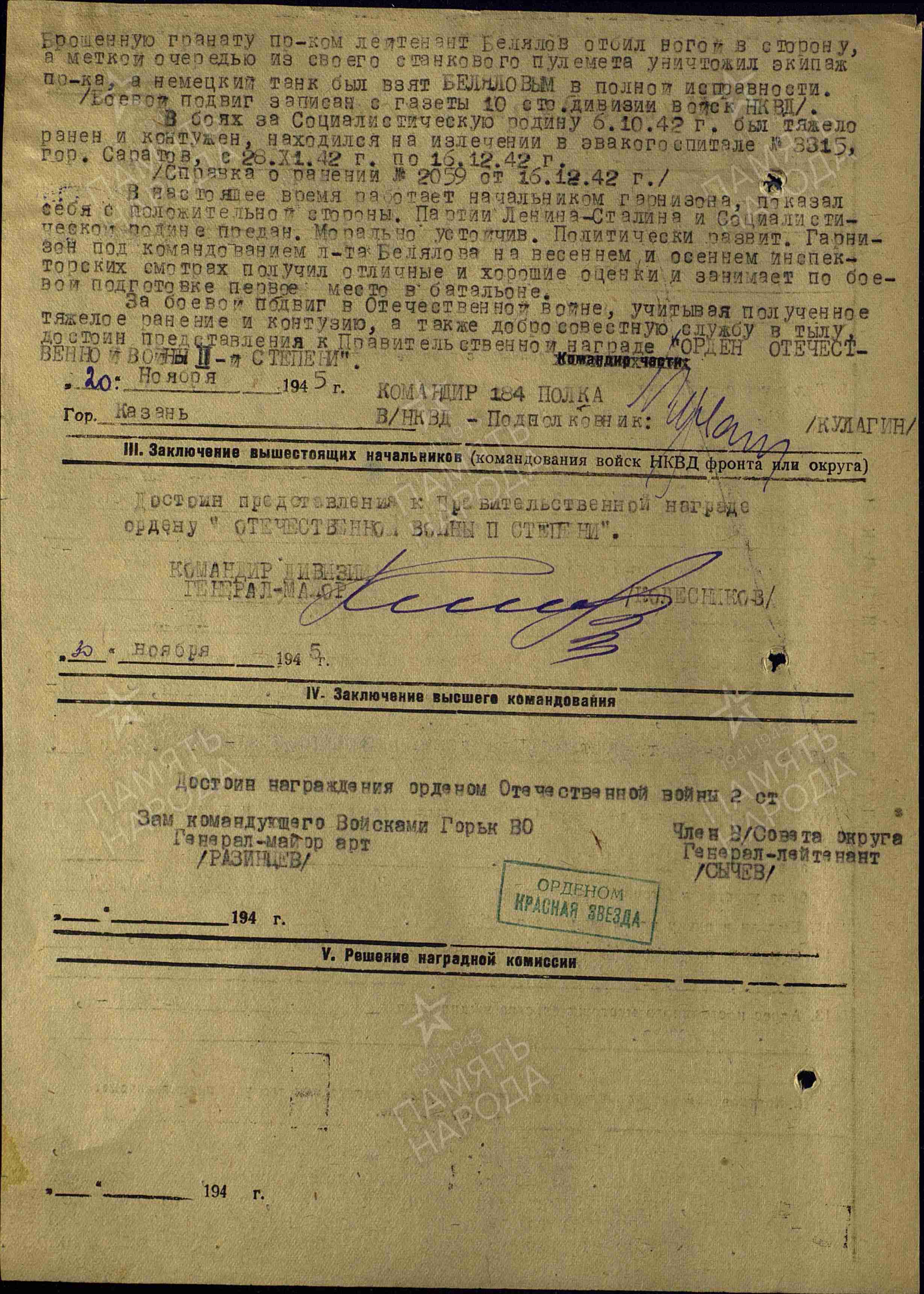 На Великую Отечественную войну призван 1941г Шугуровским РВК ТАССР. В действующей армии с 07.1942 по 10.1942 г. Воинское звание лейтенант, командир пулеметного взвода. Воинская часть 282 стрелковый полк 10 оперативной стрелковой дивизии 62 Армия Сталинградский фронт. Был тяжело ранен. 06.10.1942г в левое плечо и контужен. С 12.1942 по 12.1945 год добровольно служил в тылу -помощником начальника зоны № 67 41 12 отдельной стрелковой бригады; Прошёл курсы комсостава. в г. Хабаровск.