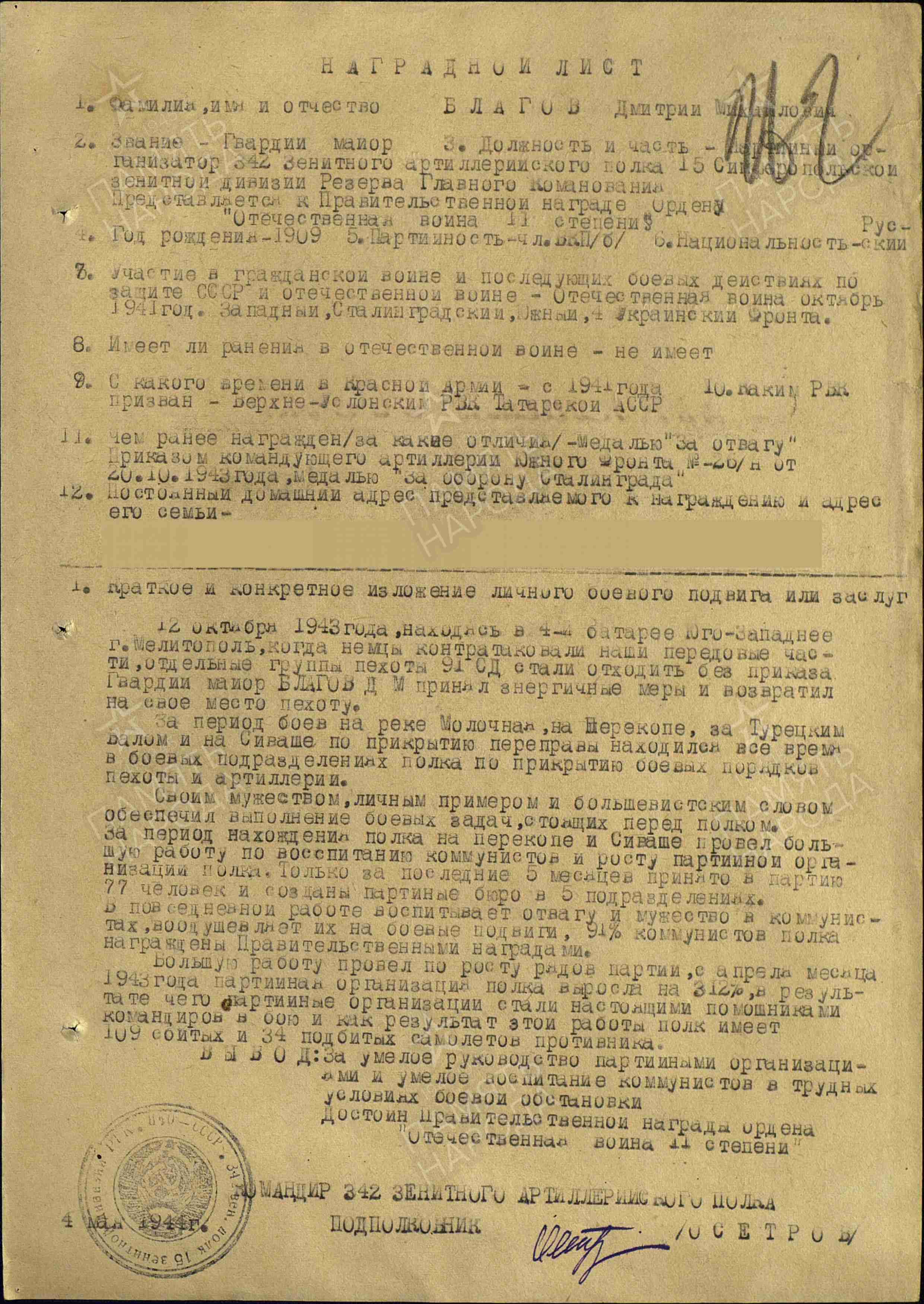 БЛАГОВ Дмитрий Михайлович, 1909, с. Шама. С 7 нояб. 1932 проходил срочную службу. Член ВКП(б). Мобилизован Верхне-Услонским РВК в авг. 1941. На фронте с авг. 1942. Гв. капитан/ гв. майор, парторг партбюро 342 ЗенАП 15 ЗенАД РГК 4 ТА Сталинградского/ Донского фронта, 65 А ДонФ, 2 гв. А/ 28 А/ 51 А/ 5 УдА Южного фронта, 51 А 4 Украинского фронта. Участник Сталинградской битвы, освобождения Украины и Крыма. Награждён медалями «За оборону Сталинграда», «За отвагу» (1943), «За боевые заслуги» (1948), двумя орденами Красной Звезды (1944, 1951), орденом Красного Знамени (1954). Окончил службу 15 фев. 1956 в звании «подполковник».