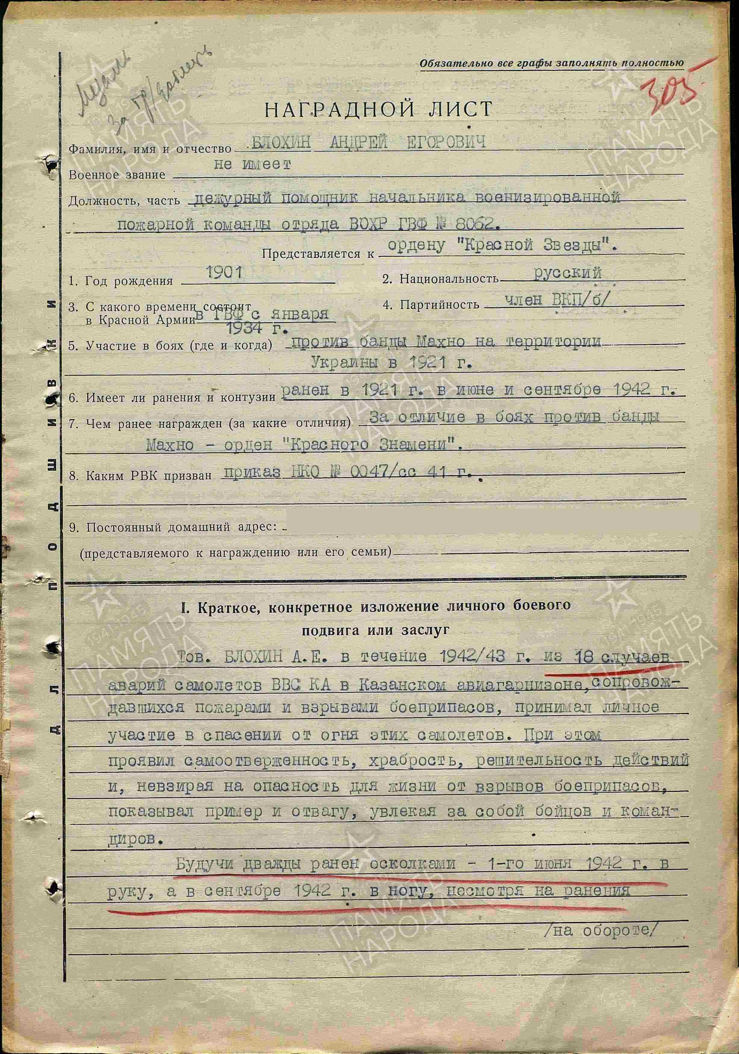 БЛОХИН Андрей Егорович, 1901, д. Берёзовка. В Красной Армии с 1920. Принимал участие в Гражданской войне против банд Махно. Красноармеец, член ВКП(б). Ранен в 1921, награждён орденом Красного Знамени РСФСР. С янв. 1934 служил дежурным пом. нач. военизированной пожарной команды отряда ВОХР ГВФ (Гражданский воздушный флот) Казанского авиагарнизона. Участвуя в спасении материальной части при авариях самолётов и ликвидации возникавших пожаров, в 1942, дважды ранен осколками детонировавших боеприпасов в руку и ногу. Представлен к ордену Красной Звезды, награждён медалью «За трудовую доблесть».