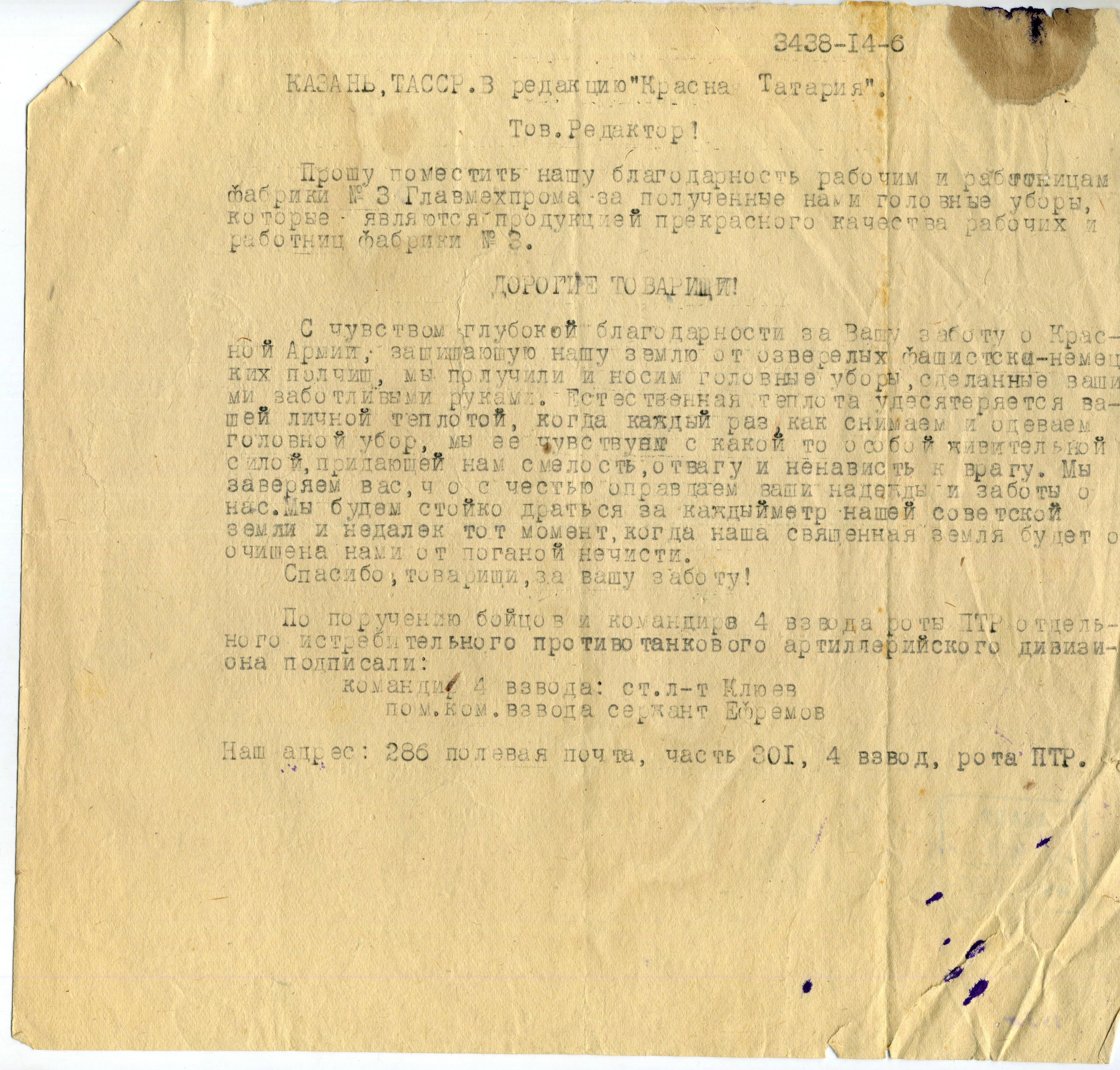С чувством глубокой благодарности за Вашу заботу о красной армии, защищающую нашу землю от озверелых фашистски-немецких полчищ, мы получили и носим головные уборы, сделанные вашими заботливыми руками. Естественная теплота удесятеряется вашей личной теплотой, когда каждый раз как снимаем и одеваем головной убор, мы ее чувствуем с какой то особой живительной силой, придающей нам смелость, отвагу и ненависть к врагу. Мы заверяем вас что с честью оправдаем ваши надежды и заботы о нас. Мы будем стойко драться за каждый метр нашей советской земли и недалек тот момент, когда наша священная земля будет очищена нами от поганой нечисти.