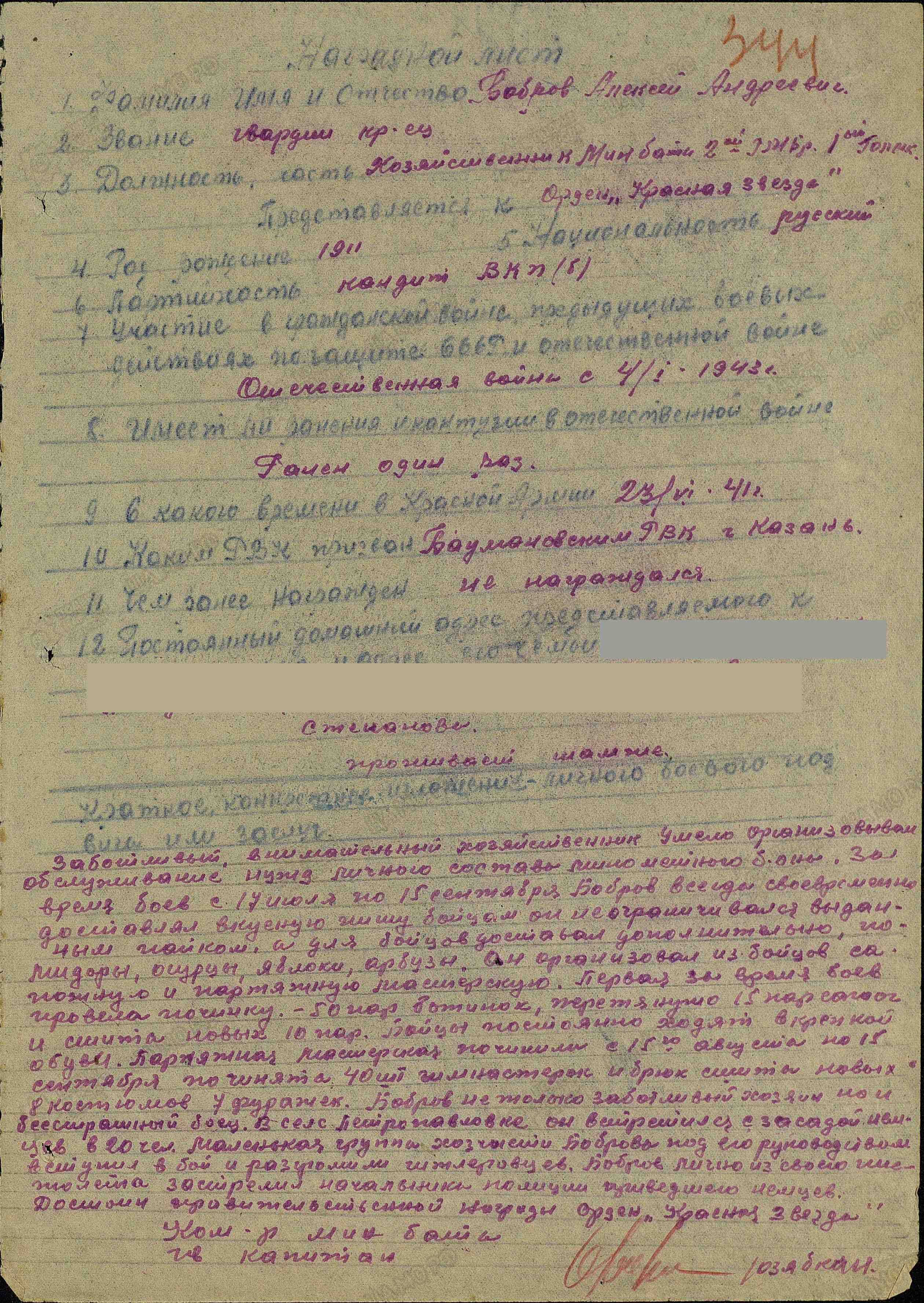 БОБРОВ Алексей Андреевич, 1911, с. Левашево. Мобилизован Бауманским РВК г. Казань 23 июня 1941 г. На фронте с 4 января 1942 г. Воевал на Юго-Западном, 3 Укр. фронтах. Гв. красноармеец миномётной батареи 2 гв. механизированной бригады 1 гв. МехК. Был легко ранен в марте 1942 г. на ЮЗФ. Позднее - гв. ст. сержант, хозяйственник (сапожник, портной) командир отделения обслуживания Отдела контрразведки "СМЕРШ" 2 гв. МехБр. Награждён орденом Красной Звезды (1943), медалью "За отвагу" - бои на территории Венгрии и Австрии в районе г. Вена (1945), орденом Отечественной войны 1 ст. (1985).