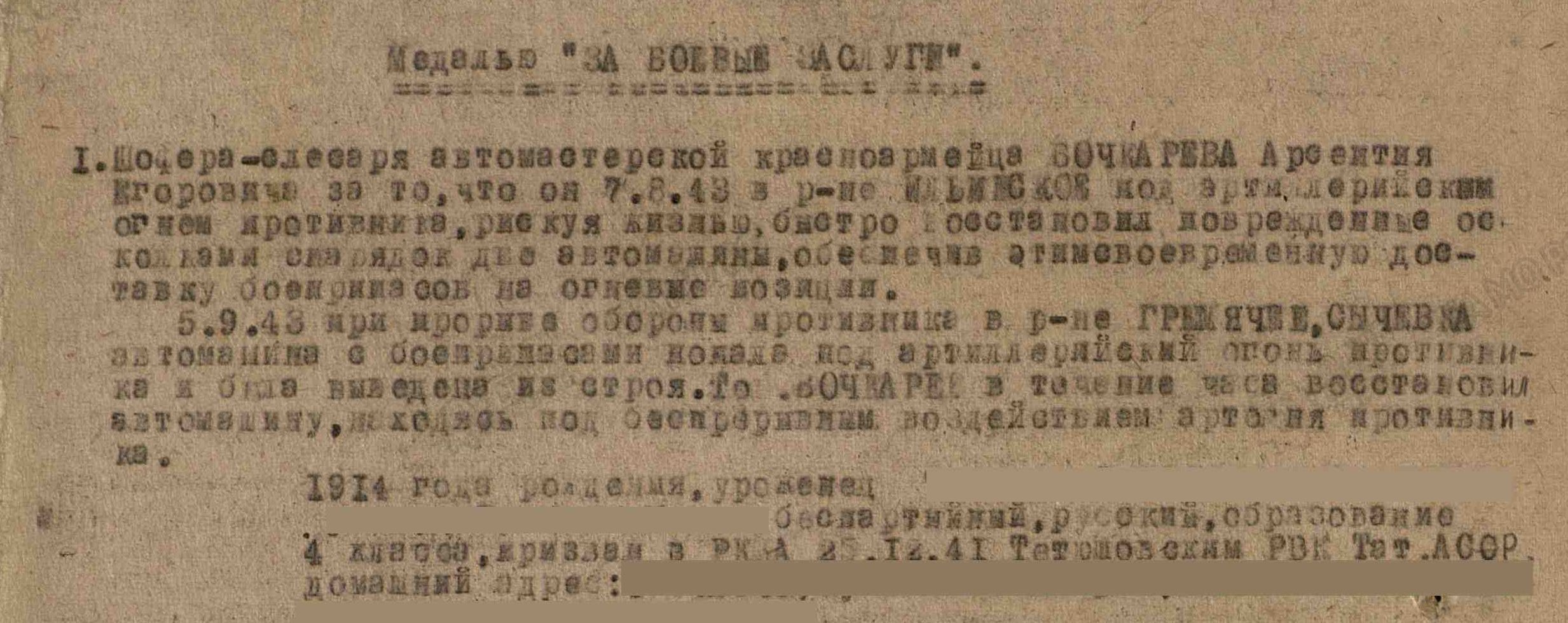 БОЧКАРЁВ Арсентий Егорович, 1914, д. Русская Майна. Мобилизован Тетюшским РВК 25 дек. 1941 г. Красноармеец. В 1943 г. - шофёр-слесарь автомастерской 1165 Корпусного артиллерийского полка 36 гв. Стрелк. Корпуса 2 Прибалт. фронта. Награждён медалью "За боевые заслуги" (1943), орденом Отечественной войны 1 ст. (1985).