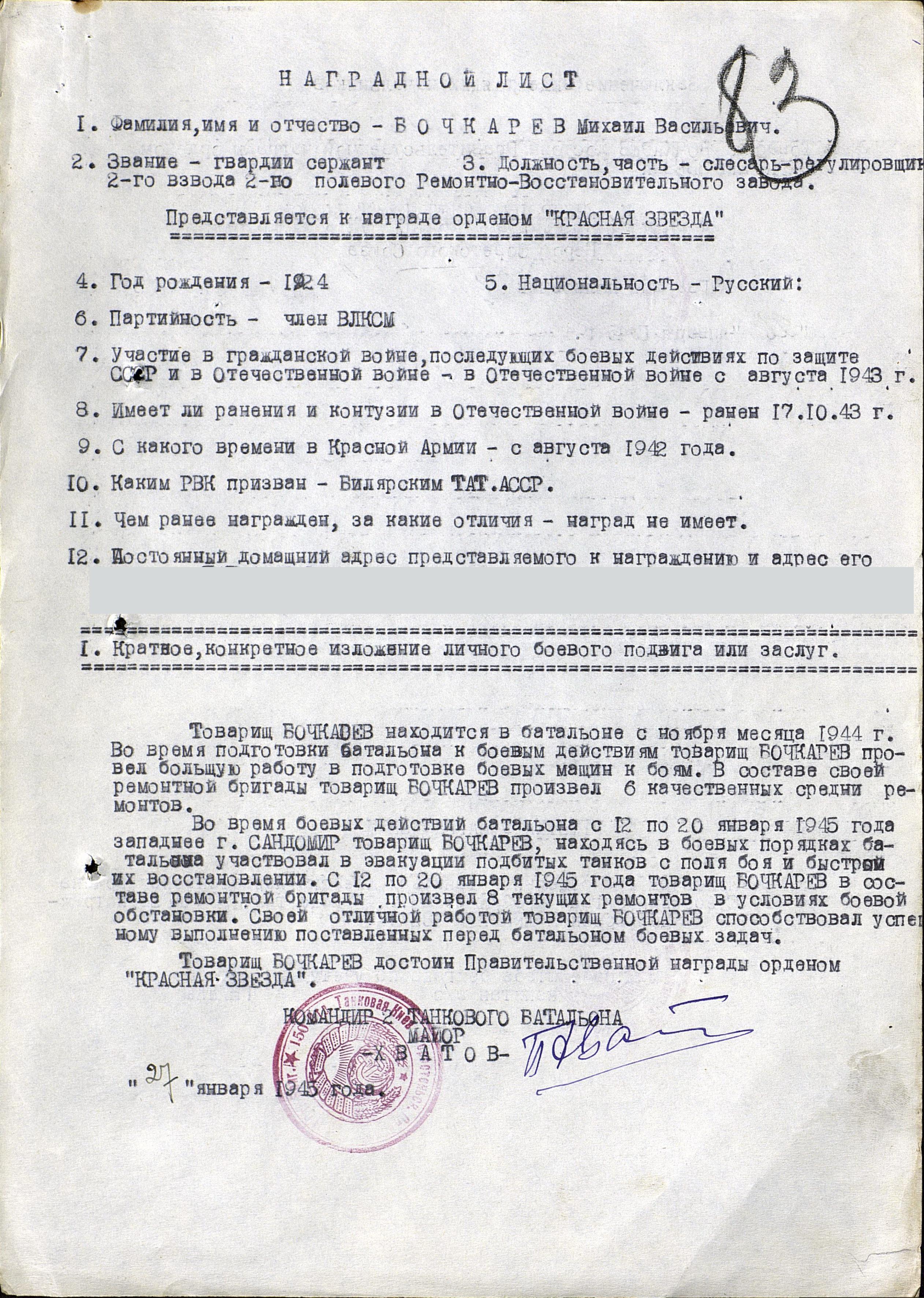 БОЧКАРЁВ Михаил Васильевич, 1924, д. Русская Майна. Мобилизован Билярским РВК в авг. 1942. В действующей армии с авг. 1943. Гв. сержант. 17 окт. 1943 был ранен. С ноября 1944 - слесарь-регулировщик 2 полевого Ремонтно-восстановительного завода 1 УкрФ. Отличился в боях за г. Сандомир 12-20 янв. 1945. Участвовал в эвакуации подбитых танков с поля боя и быстром их восстановлении. Произвёл качественно шесть средних и восемь текущих ремонтов 150 ТБр. Награждён орденом Красной Звезды. В 1945 г. принимал участие в войне с японцами на Дальнем Востоке.