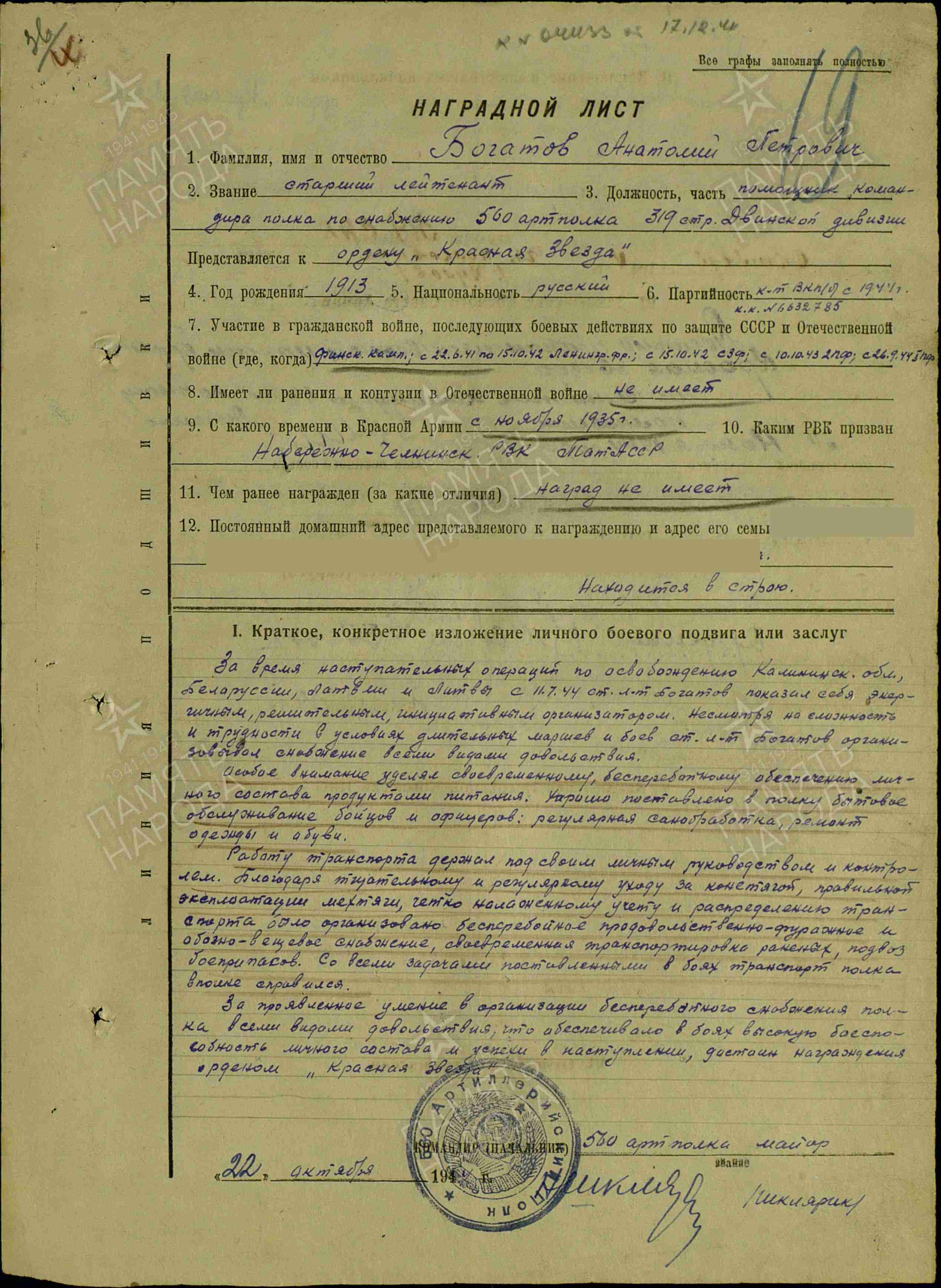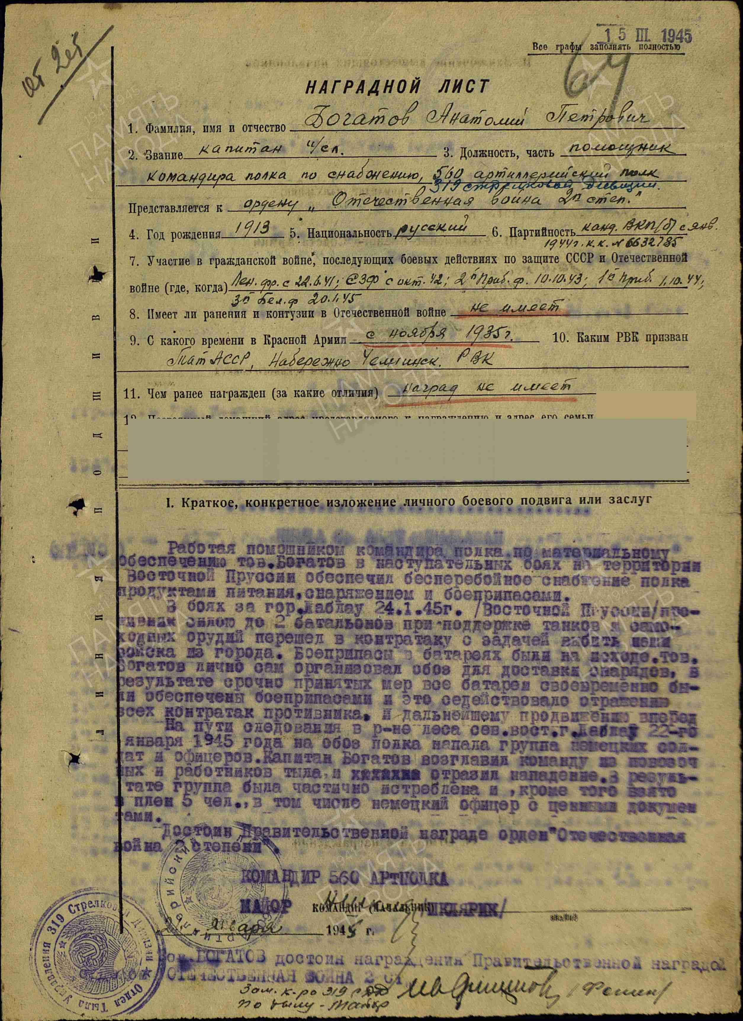 БОГАТОВ Анатолий Петрович,1913, д. Гоголиха. Призван в РККА 3 дек. 1935 Челнинским РВК. Участвовал в боях на оз. Хасан, Советско-финской войне, обороне Ленинграда, боях на Северо-Западном фронте, освобождении Прибалтики, штурме Кёнигсберга, Советско-Японской войне. Лейтенант интендантской службы, склад 1539 НКО, автотранспортный батальон 54 А ЛенВО/ Ленинградского фронта. Канд. ВКП(б). С нояб. 1943 – ст. лейтенант/ капитан интенд. службы, пом. ком. по снабжению 560 АП 319 СД 22 А/ 3 УдА 2 Прибалтийского фронта, 2 гв. А/ 43 А 1 Прибалт./ 3 Белорусского/ 2 Белорусского фронта. Награждён медалями «За оборону Ленинграда», «За боевые заслуги», «За взятие Кёнигсберга», «За победу над Японией», орденами Красной Звезды (1945, 1950), Отечественной войны 2 ст. (1945). Скончался в 1979.