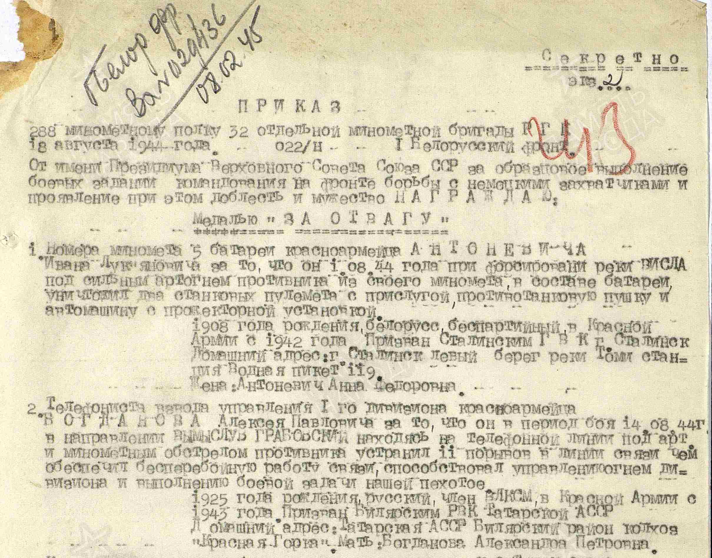 БОГДАНОВ Алексей Павлович, 1925, с. Красная Горка. До призыва в армию работал на свиноферме к-за "Красная Горка". Мобилизован 6/ 12 янв. 1943. В боях июня 1943. Красноармеец, телефонист взвода управления дивизиона 288 МинП 32 отд. МинБр РГК в составе 34 А Северо-Западного фронта, 47 А/ 8 гв. А/ 61 А/ 33 А/ 5 УдА 1 Белорусского фронта. Награждён медалями «За отвагу», «За освобождение Варшавы», «За взятие Берлина», орденом Отечественной войны 2 ст. (1985).