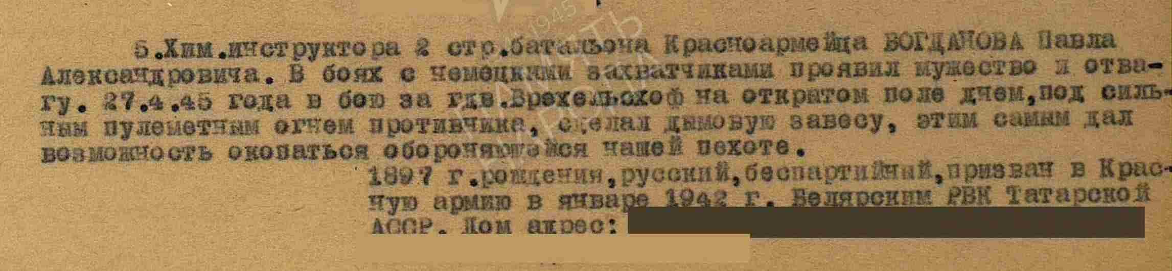 БОГДАНОВ Павел Александрович, 1897, с. Богоявленская Горка. Мобилизован Билярским РВК 31 янв. 1942. Красноармеец. Воевал в составе 277 СП 183 СД 40 А/ 69 А Воронежского, Степного фронта, 1 гв. А 1 Украинского фронта. Ранен в 1943, лечился в ГЛР 107, с фев. 1944 – химик-инструктор 494 СП 174 СД 31 А 1 Украинского фронта. Награждён медалью «За отвагу».