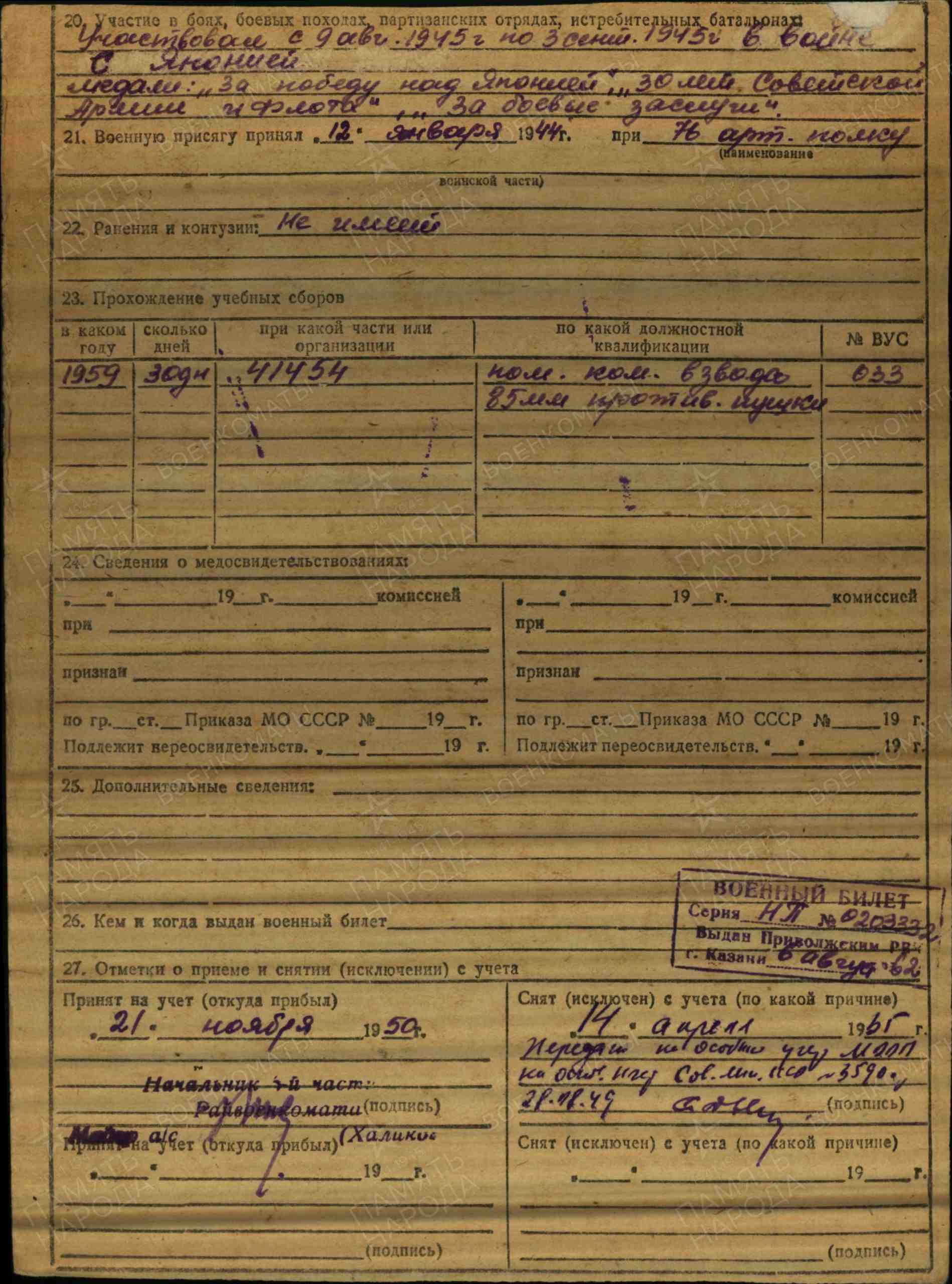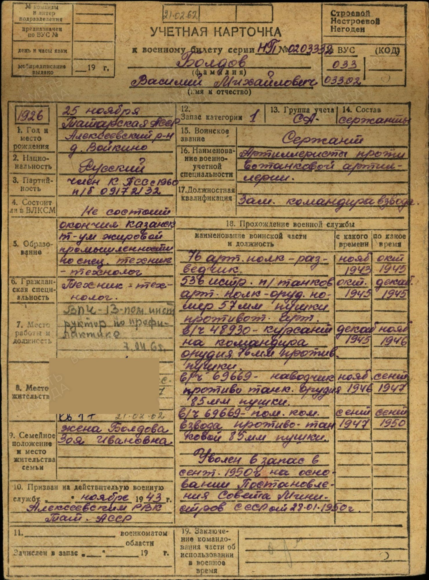 БОЛДОВ Василий Михайлович, 1926, д. Войкино. Мобилизован в нояб. 1943 Алексеевским РВК. Сержант, разведчик 76 АП 35 А 1 Дальневосточного фронта. Демобилизован в сент. 1950 в должности пом. ком. 85 мм ПТО. Жил в г. Казань. Награждён медалями «За боевые заслуги», «За победу над Японией», орденом Отечественной войны 2 ст. (1985).