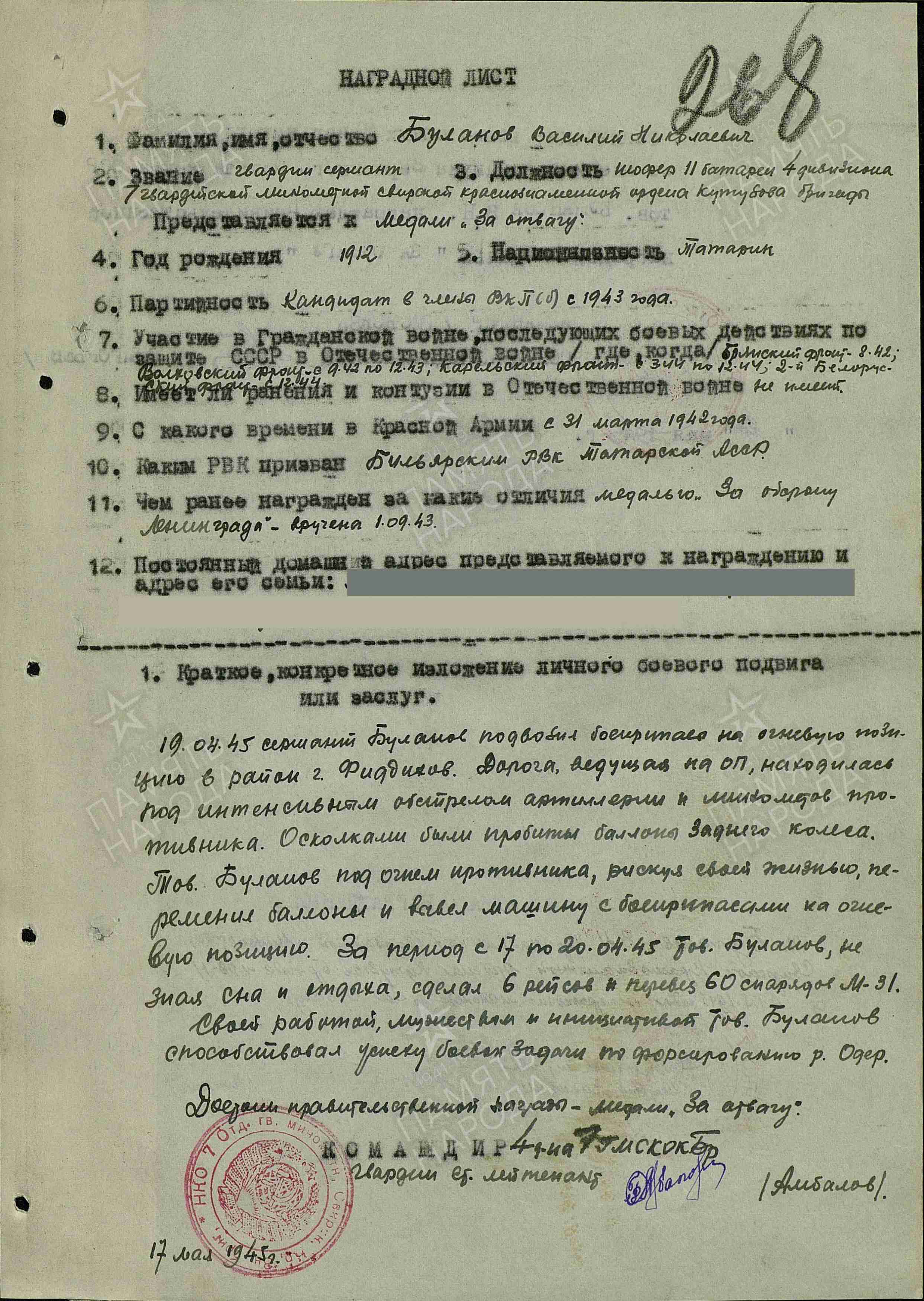 БУЛАНОВ Василий Николаевич, 1912, с. Крещёный Баран. До призыва в армию работал в к-зе «Семеновод». Мобилизован Билярским РВК 31 марта 1942. Гв. сержант, шофёр батареи 7 отд. гв. МинБр. Канд. ВКП(б). Воевал на Брянском, Волховском (8 А/ 59 А), Карельском (19 А/ 7 А/ 14 А), 2 Белорусском (2 УдА, 19 А, 49 А) фронте. Награждён медалями «За оборону Ленинграда», «За отвагу». Умер в 1977.