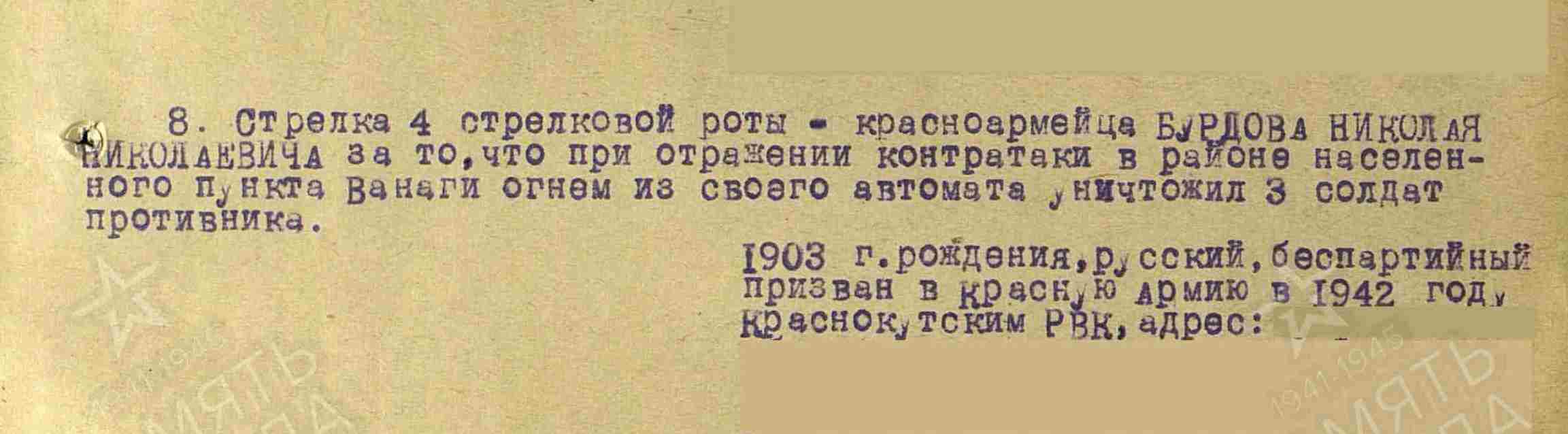 БУРДОВ Николай Николаевич, 1903, с. Большие Полянки. Мобилизован Краснокутским РВК Саратовской обл. в 1942, повторно – 22 мая 1944 Фрунзенским РВК г. Москва. В 1944-1945 - красноармеец, 1376 СП 417 СД 51 А 1 Прибалтийского фронта. Награждён медалью «За отвагу». Убит 30 янв. 1945, хут. Тубели, Айзпутская волость, Лиепайский уезд, ЛатвССР.