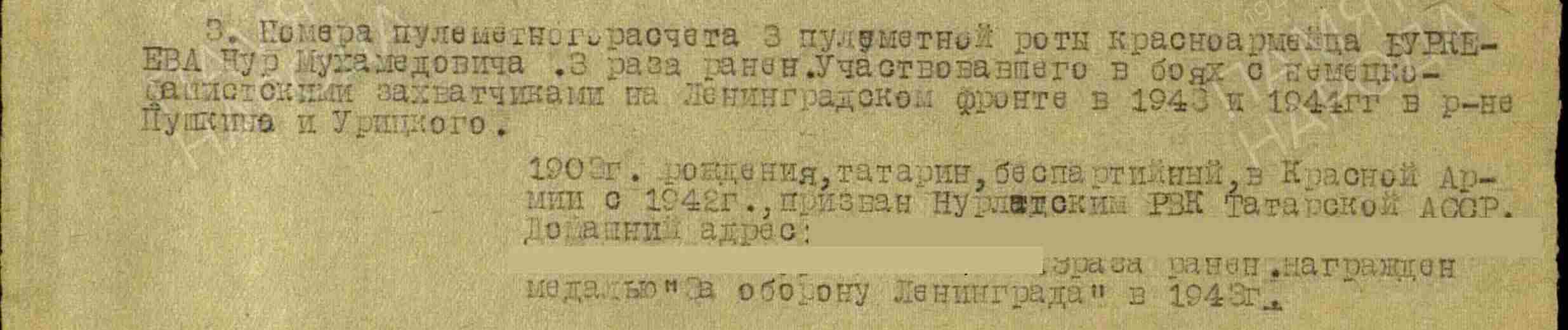 БУРКЕЕВ Нур Мухамедович, 1903, с. Большие Тиганы. Мобилизован Нурлатовским (Зеленодольским) РВК 2 июня 1942. Красноармеец, стрелок, номер пулемётного расчёта 602 СП 109 СД 42 А/ 2 УдА, 593 СП 131 СД 2 УдА/ 8 А Ленинградского фронта. В боях трижды ранен. Награждён медалями «За оборону Ленинграда», «За отвагу». По отчёту потерь 131 СД учтён погибшим 22 окт. 1944, п-ов Сырве, о. Эзель (Сааремаа), ЭстССР. По другим данным поступил 19 нояб. 1944 в ЭГ 1359, г. Ленинград, выбыл из госпиталя 14 дек. 1944.