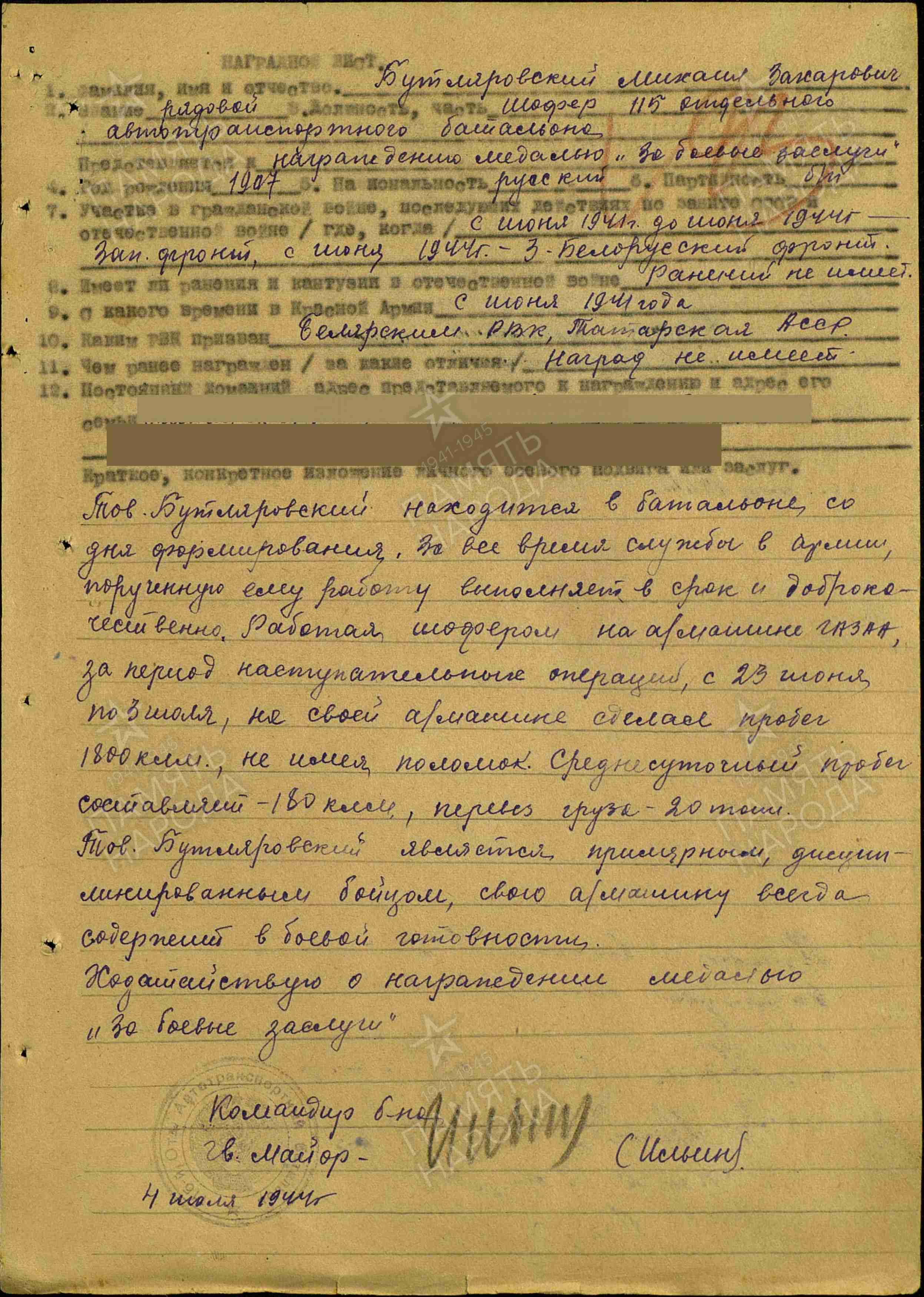 БУТЛЕРОВСКИЙ Михаил Васильевич (Захарович), 1907, с. Билярск. Мобилизован Билярским РВК 24 июня 1941. Красноармеец, шофер а/м ГАЗ-АА 115 отд. автотранспортного батальона 31 А Калининского/ Западного/ 3 Белорусского/ 1 Украинского фронта. Награждён медалью «За боевые заслуги», орденом Отечественной войны 2 ст. (1985).