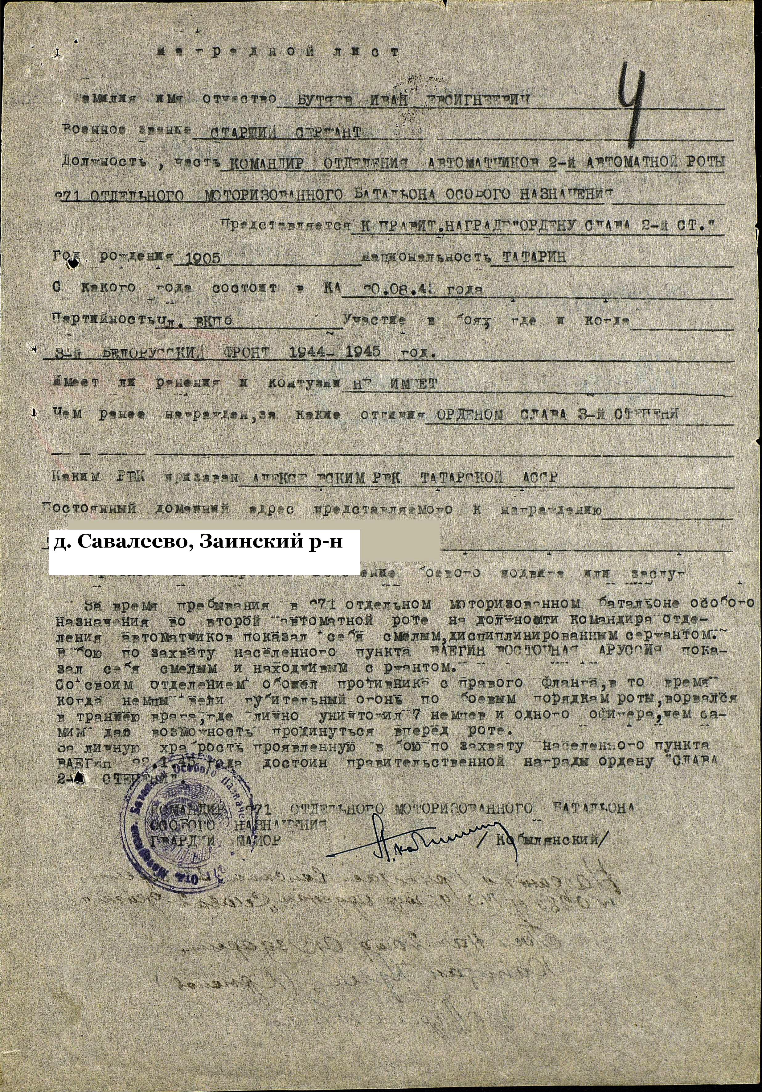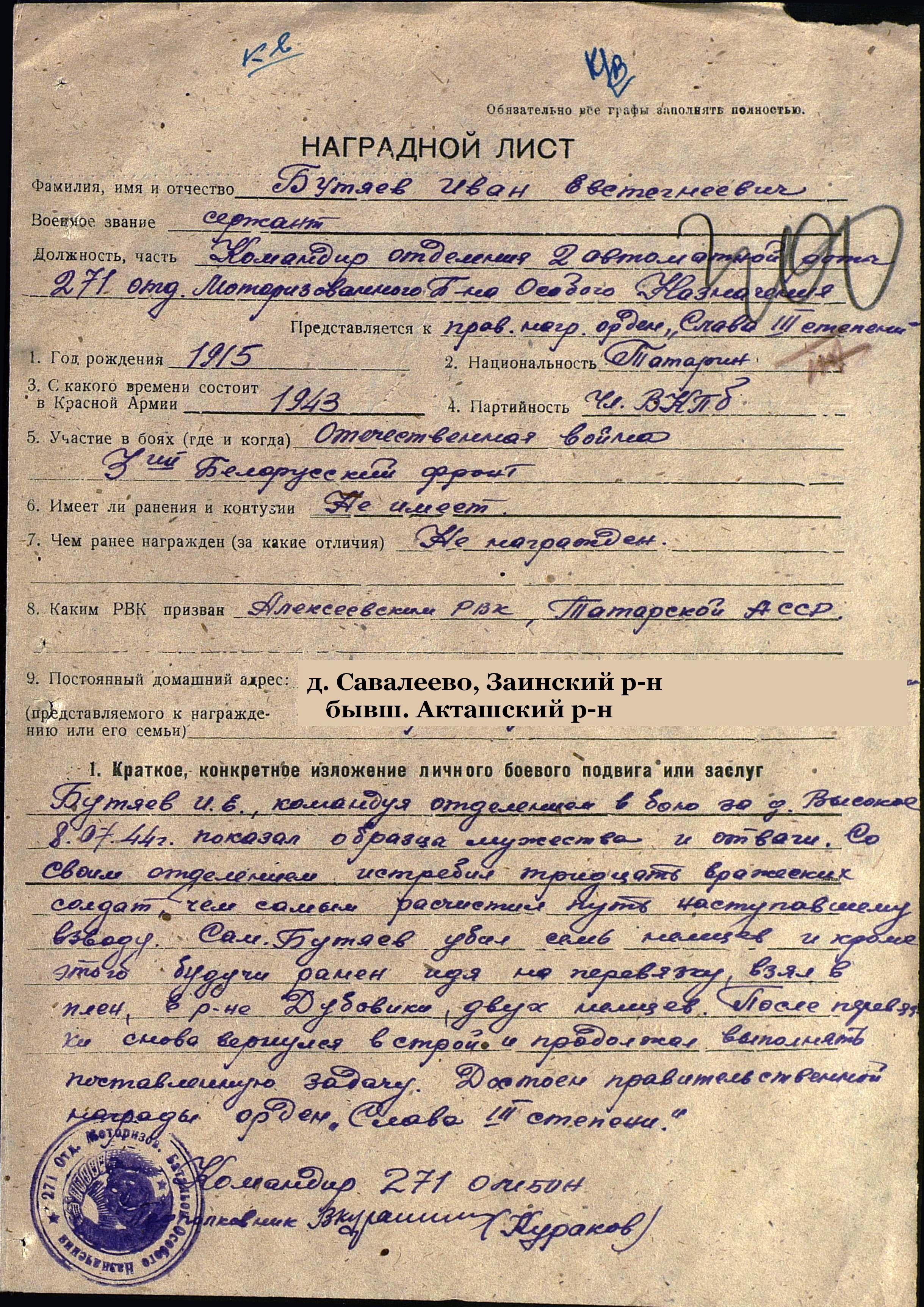 БУТЯЕВ Иван Евстигнеевич, 1905, с. Савалеево (бывш. Акташский, ныне Заинский район РТ). До войны работал начальником отдела НКВД в Алексеевском районе. Мобилизован Алексеевским РВК в 1943 г. Сержант, командир отделения 271 отдельного моторизованного батальона особого назначения бронетанковых и механизированных войск в составе 39 А 3 Белорусского фронта. Участвовал в освобождении Белоруссии и боях в Восточной Пруссии. Награждён орденами Славы 3 и 2 ст.