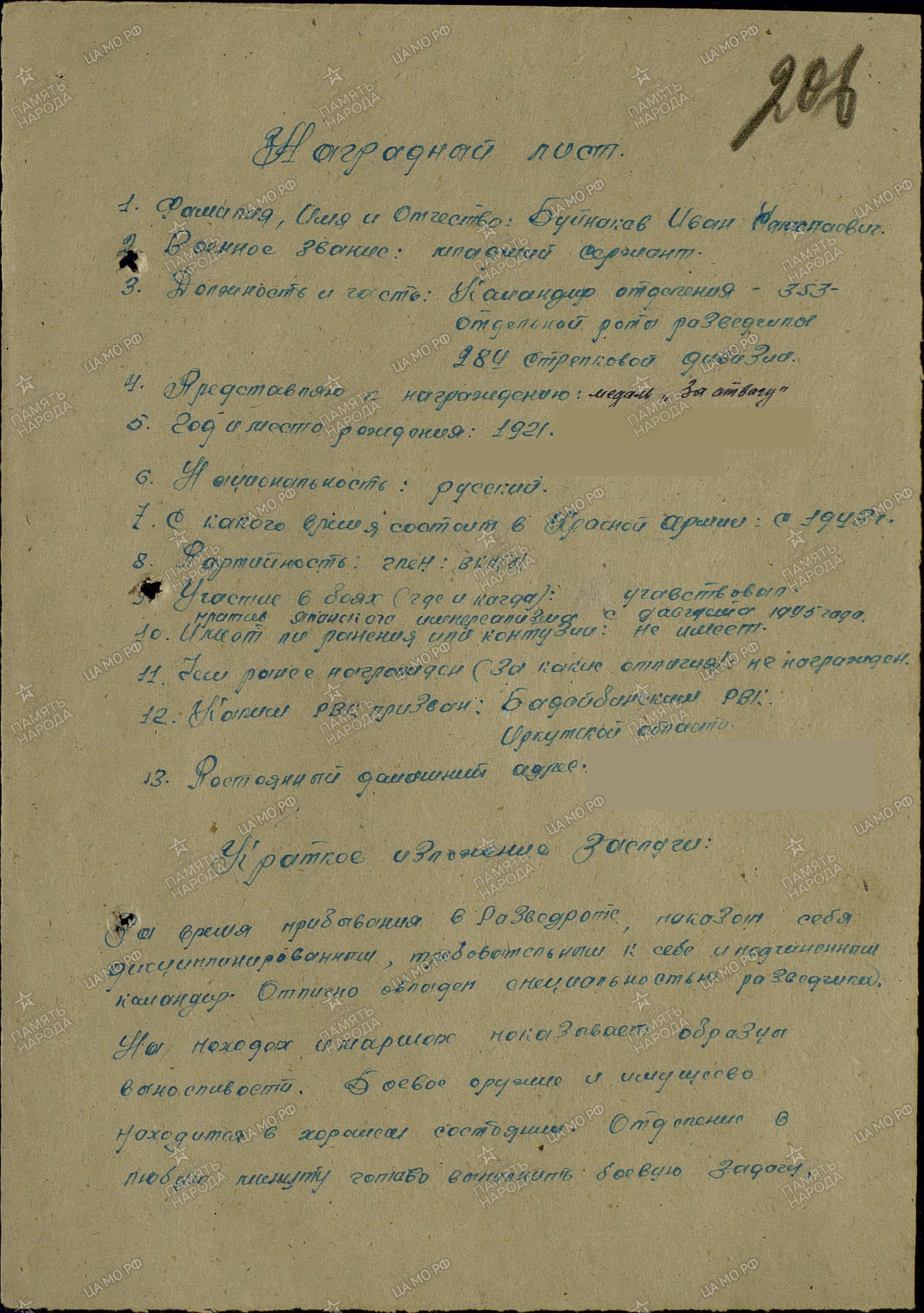 Буйнаков Иван Николаевич родился в 1921 году. Работать начал в 1939 году кочегаром на паровозах. В 1941 году был призван в Красную Армию. Воевал разведчиком. Награждён за боевые подвиги медалями «За отвагу», «За победу над Японией».