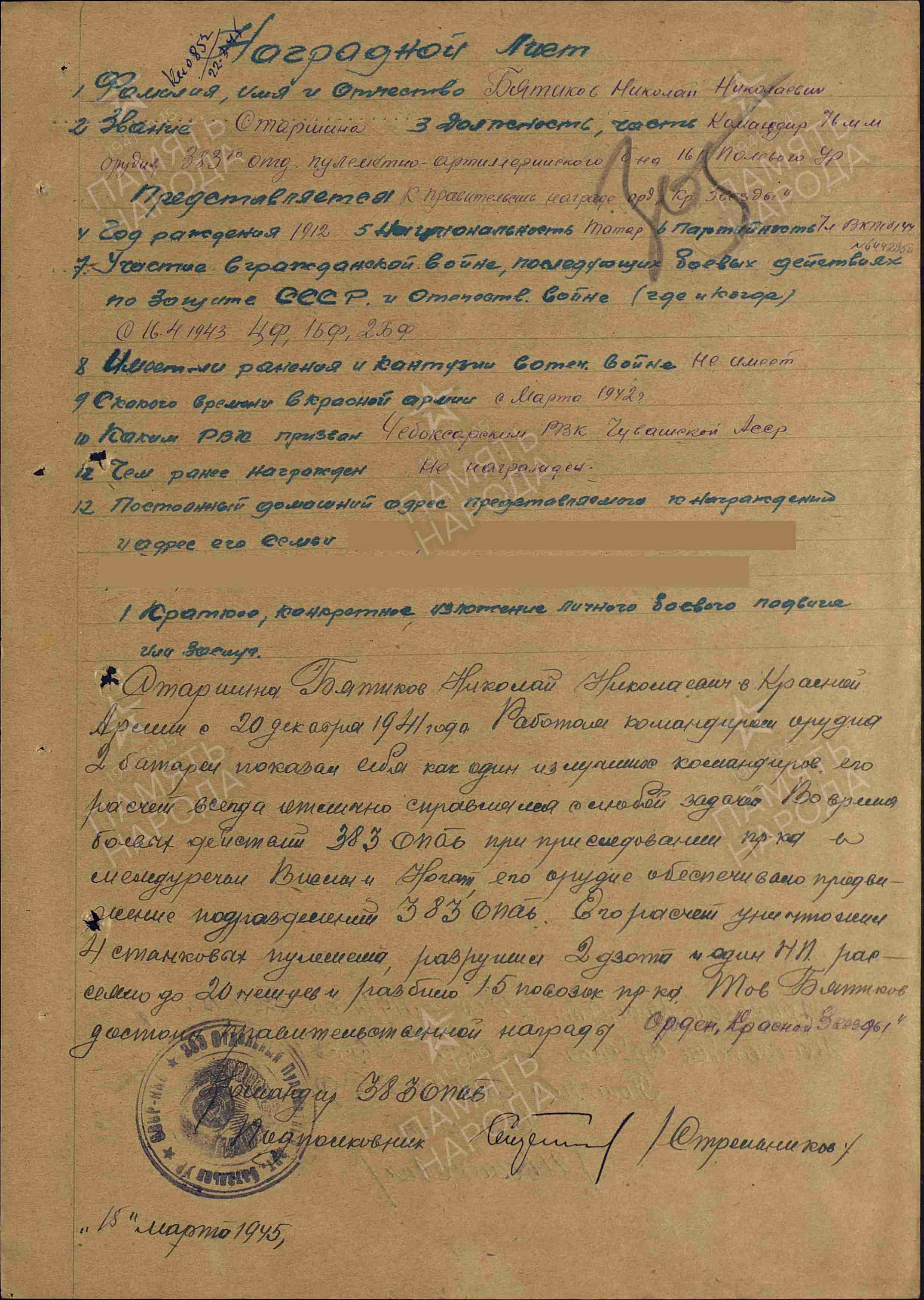 БЯТИКОВ Николай Николаевич, 1912, с. Лебедино. Мобилизован 28 дек. 1941 Чебоксарским ГВК ЧувАССР. Воевал с 16 апр. 1943 в составе 48 А/ 65 А/ 50 А/ 2 УдА на Центральном, Белорусском, 1 и 2 Белорусском фронте. Член ВКП(б) с 1944. Старшина, ком. 76 мм орудия 384 отд. пулемётно-артиллерийского батальона 161 полевого укреп. района. Награждён орденами Красной Звезды, Отечественной войны 2 ст. (1985).