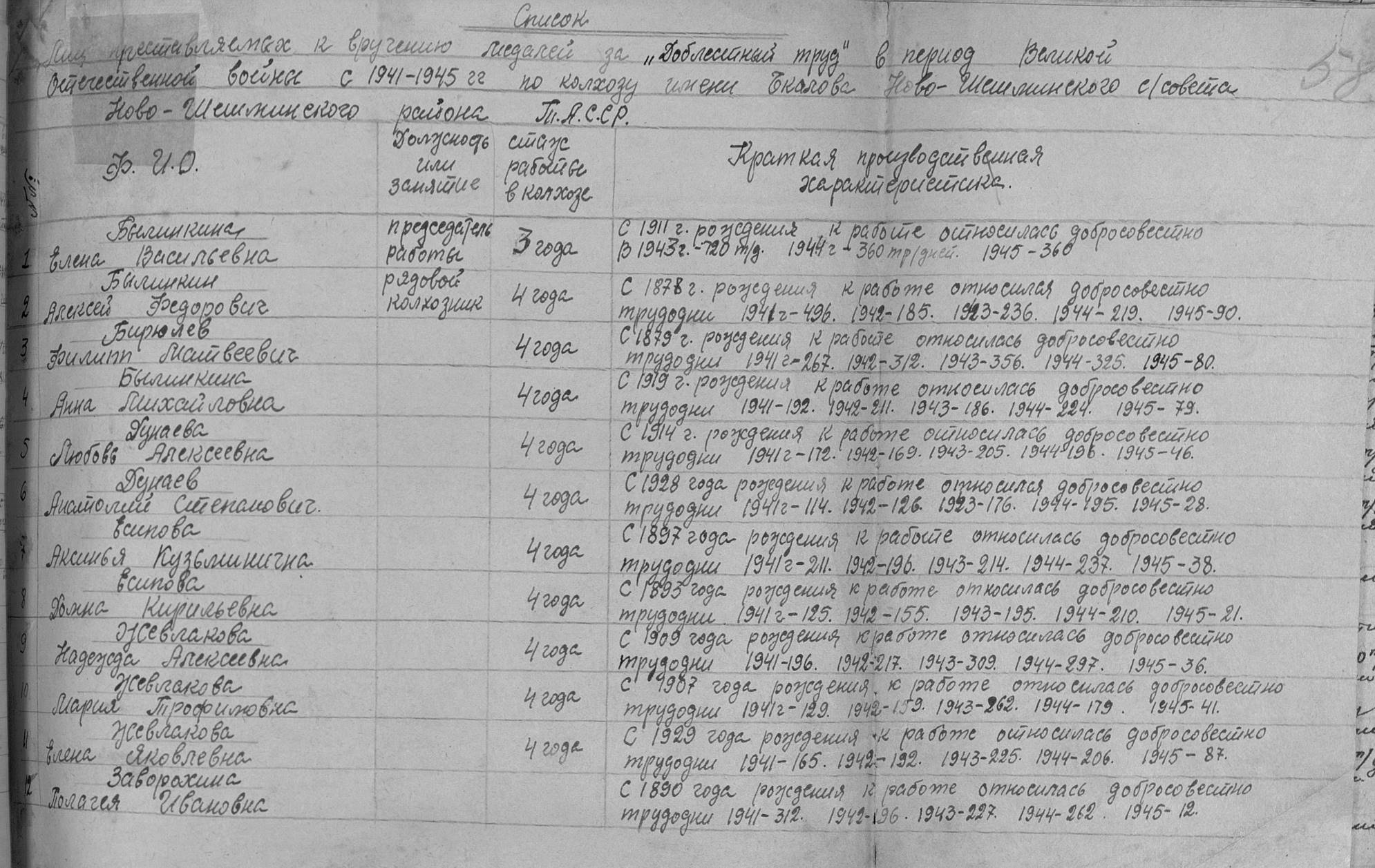 Былинкина Елена Васильевна родилась в 1914 году в с.Новошешминск Казанской губернии Чистопольского уезда Новошешминской волости. В годы войны работала в колхозе им.Чкалова председателем. Награждена медалью "За доблестный труд в Великой Отечественной войне 1941–1945 гг." (Акт от 01.1946 г., фонд 3610, опись 2, дело № 174, лист 58).