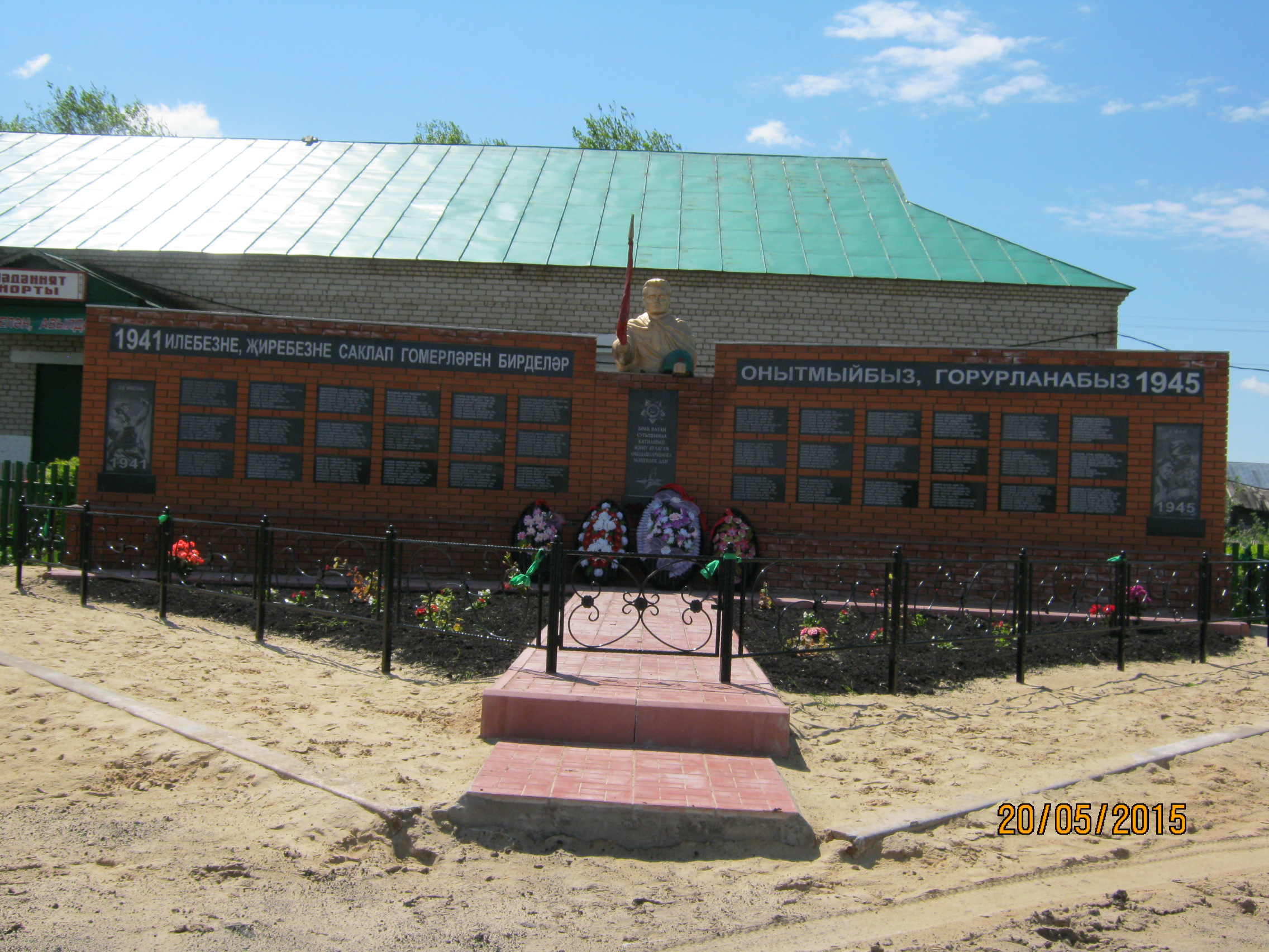 Композиция состоит из бюста солдата высотой -1,2 м, постамента для солдата (1х2,8)и стены с двух сторон по 6м. Высота стены 3м,На стене((кладка из краного кирпича)имеются черные мраморные плиты(30х60см.)-36 шт. с именами участников -земляков Вов.Имеется гранитная плита с гравировкой "Комбат", "Возвращение солдата" На верхней части стены с2-х сторон имеется гравированная надпись "1941 Илебезне, җиребезне саклап гомерләрен бирделәр. Онытмыйбыз, горурланабыз. 1945" Над бюстом солдата гравировка(1,2х06) "Бөек Ватан сугышында катнашып җиңү яулаган авылдашларыбызга мәңгелек дан", на верхней части - Орден красной Звезды, на нижней части изображен "вечный огонь". Бюст состоит из туловища солдата, знамени и каски.