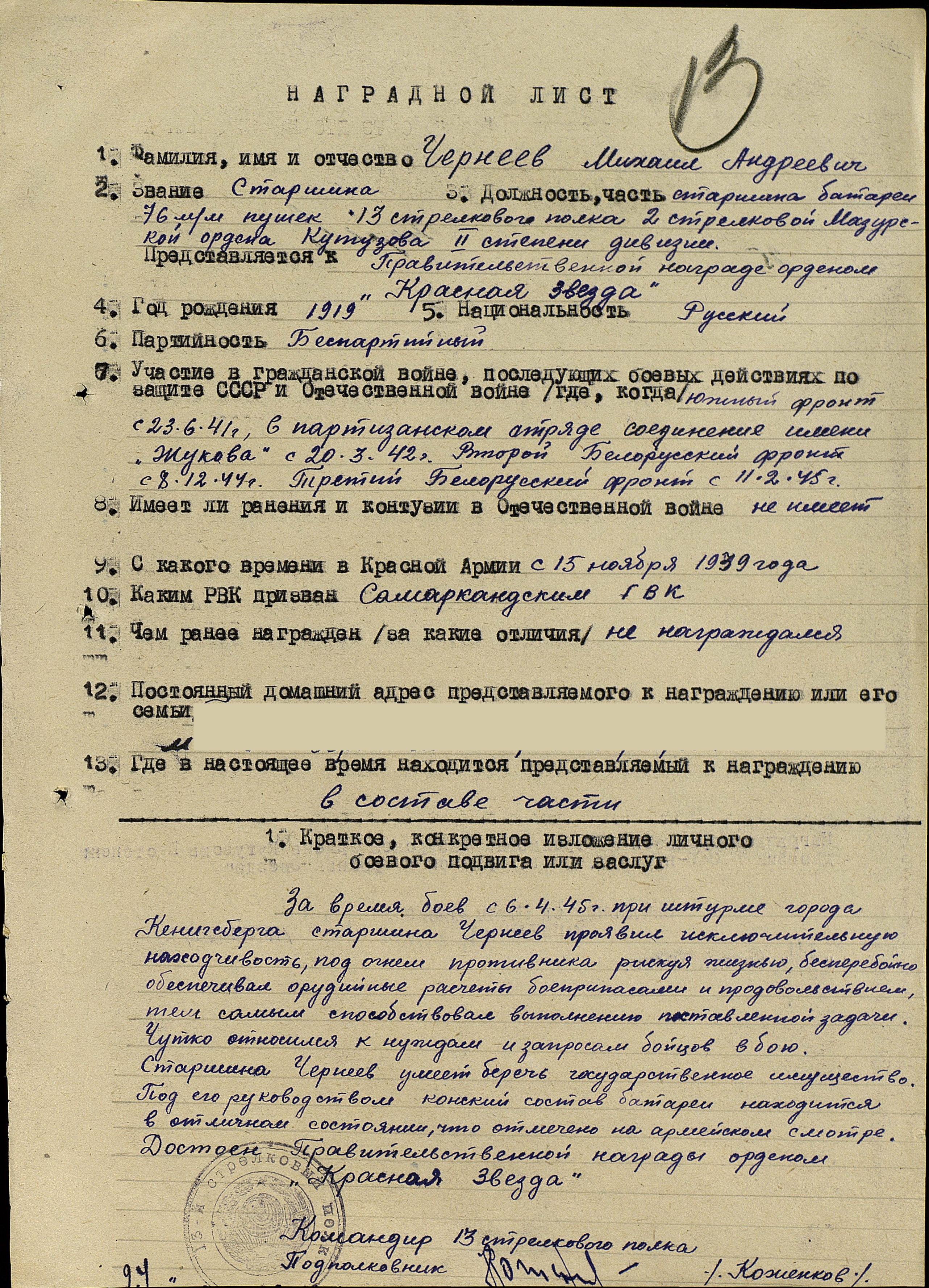 ЧЕРНЕЕВ Михаил Андреевич, 1919, с. Билярск. Мобилизован в 1939 г. Войну встретил на западной границе (Южный фронт). В бою был ранен и был учтён как погибший. С марта 1942 г. по декабрь 1944 г. состоял в партизанском отряде им. Жукова, далее воевал на 3 и 2 Белорусском фронтах, старшина батареи 76 мм пушек 13 стр. полка 2 стр. дивизии. Участвовал в штурме Кёнигсберга. Награждён двумя орденами Красной Звезды, медалями "За боевые заслуги", "За взятие Кёнигсберга", "За победу над Германией". После войны жил на Украине.